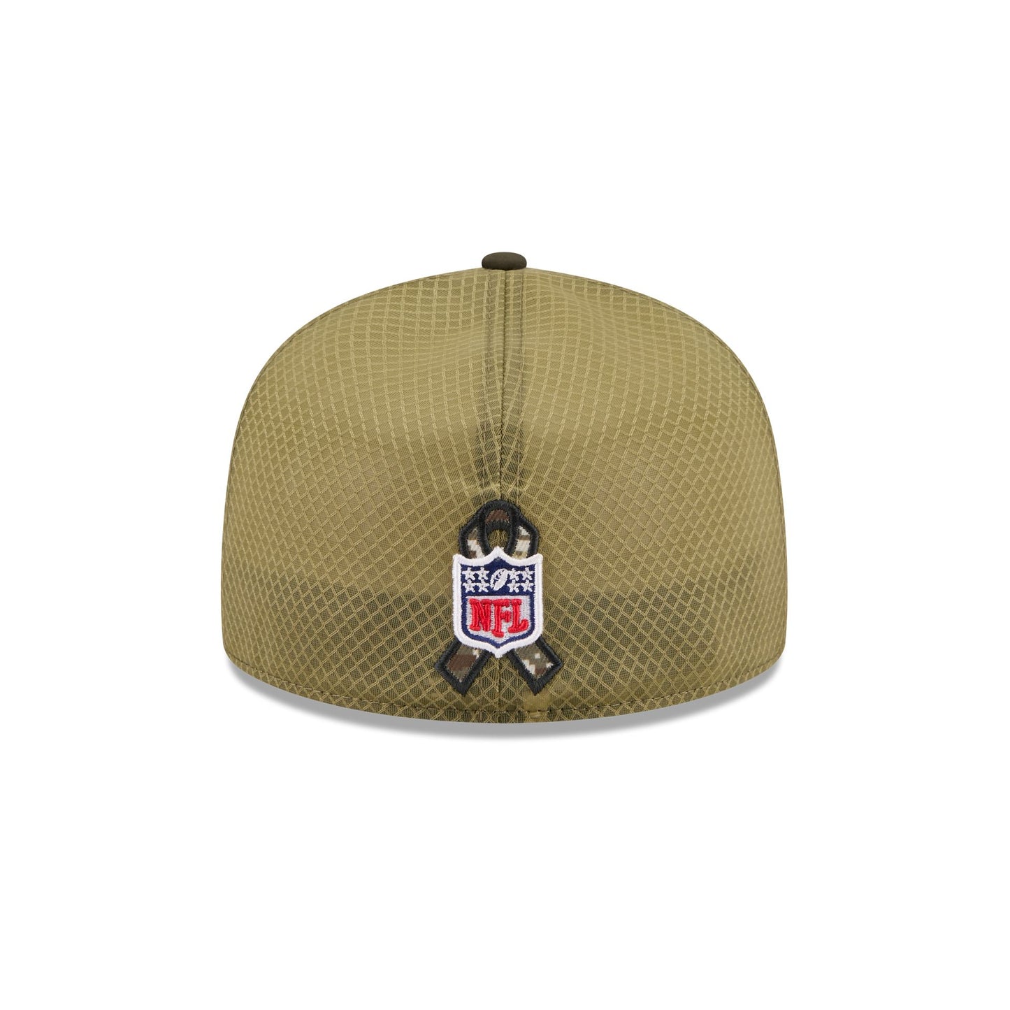 The Philadelphia Eagles 2025 Salute to Service 59FIFTY Fitted Cap features an embroidered Eagles logo at the front panels with the official NFL Salute to Service patch at the rear mesh panels. Additional details include an American flag patch at the right-wear side with a silicone team logo patch at a dark green undervisor and a digi camo interior fabrication.