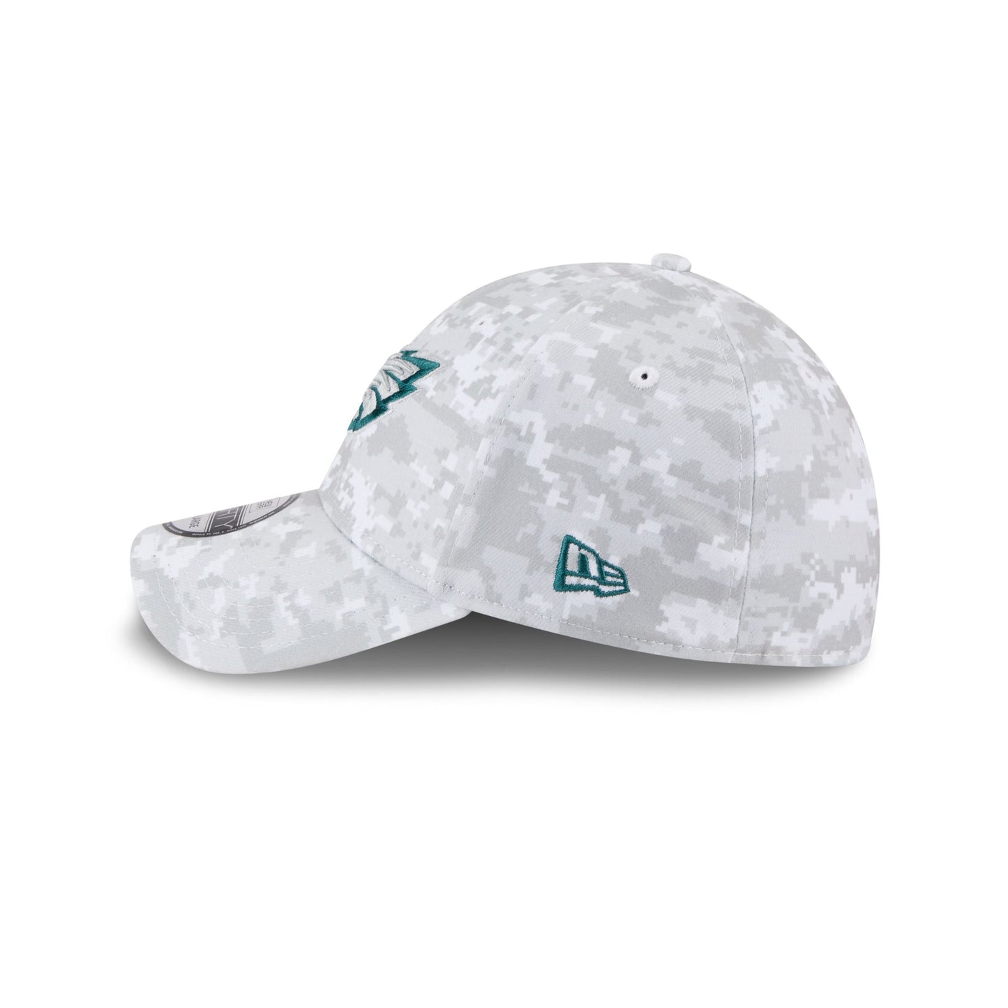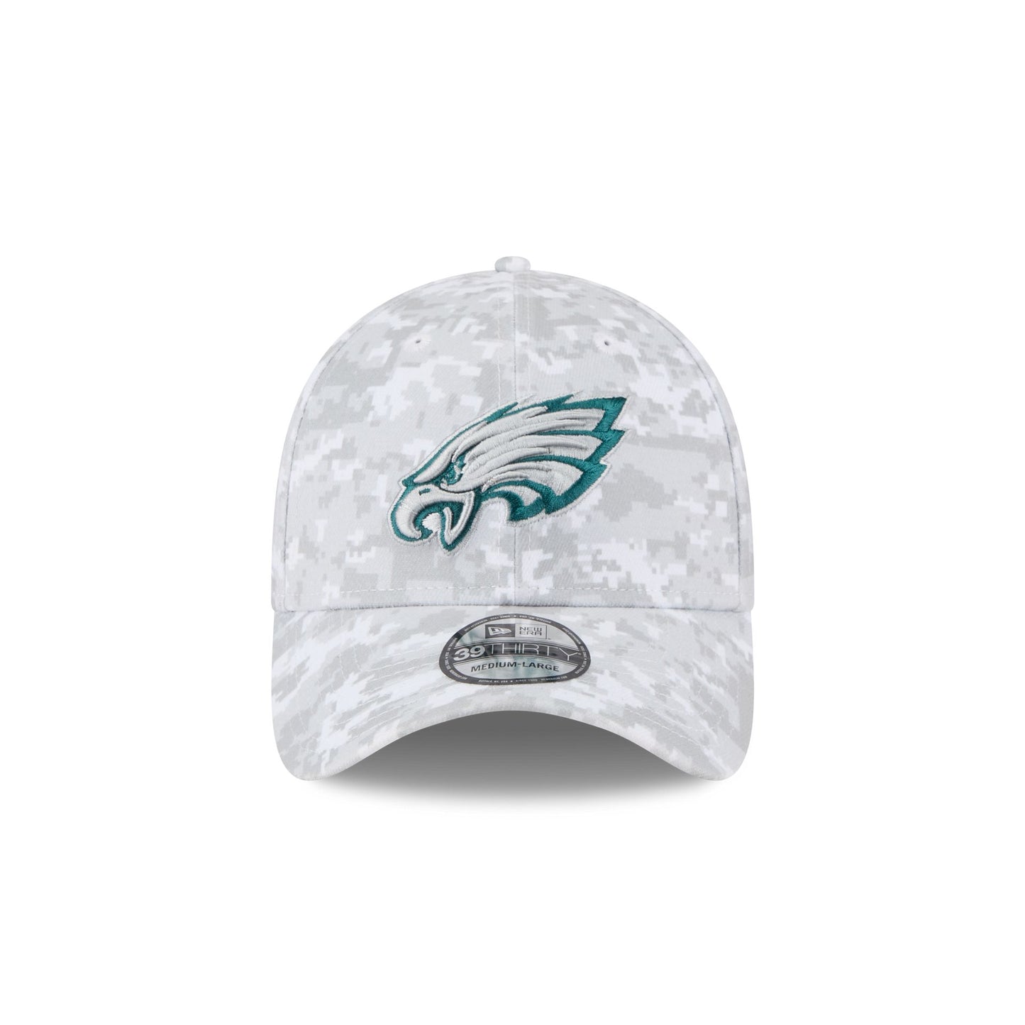 The Philadelphia Eagles 2025 Salute to Service Fan Gear 39THIRTY Stretch Fit Cap features an embroidered Eagles logo at the front panels with the official NFL Salute to Service patch at the rear, an American flag patch at the right-wear side, and a team color undervisor.