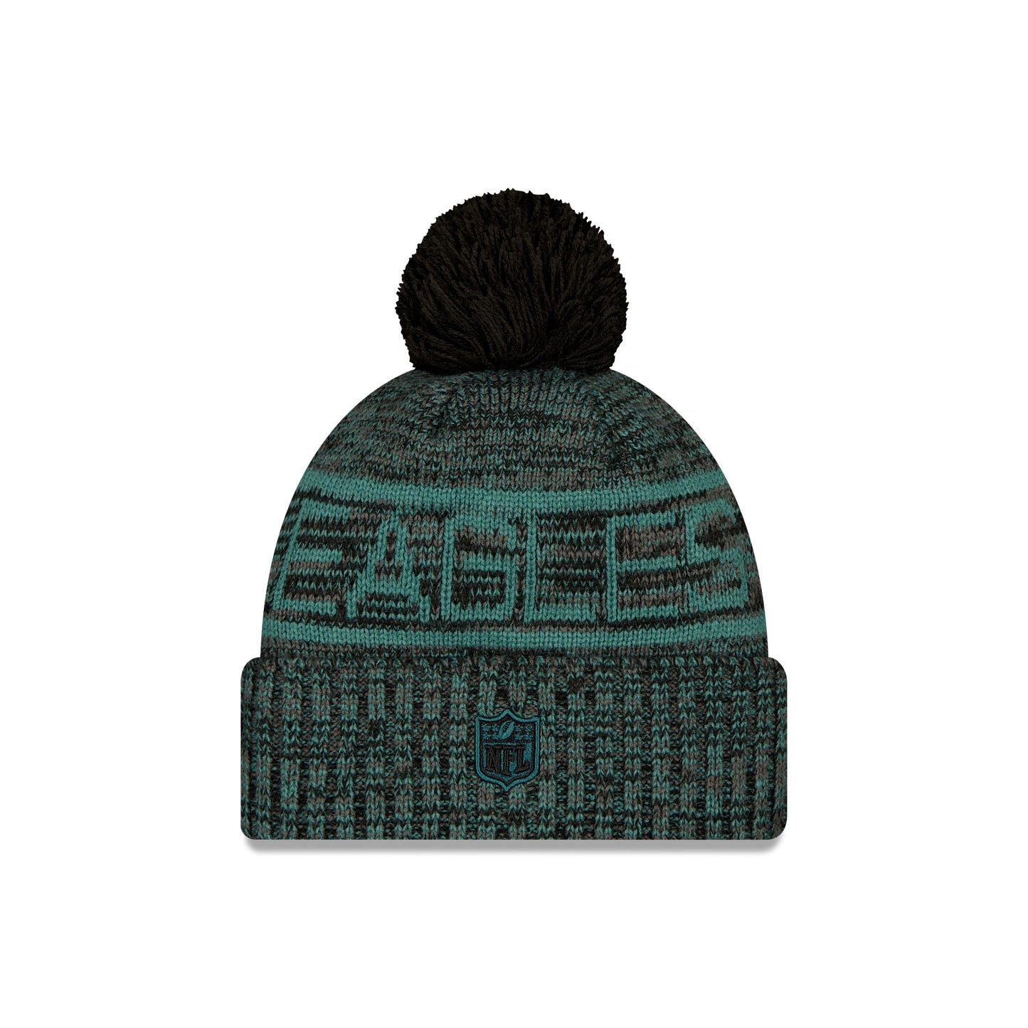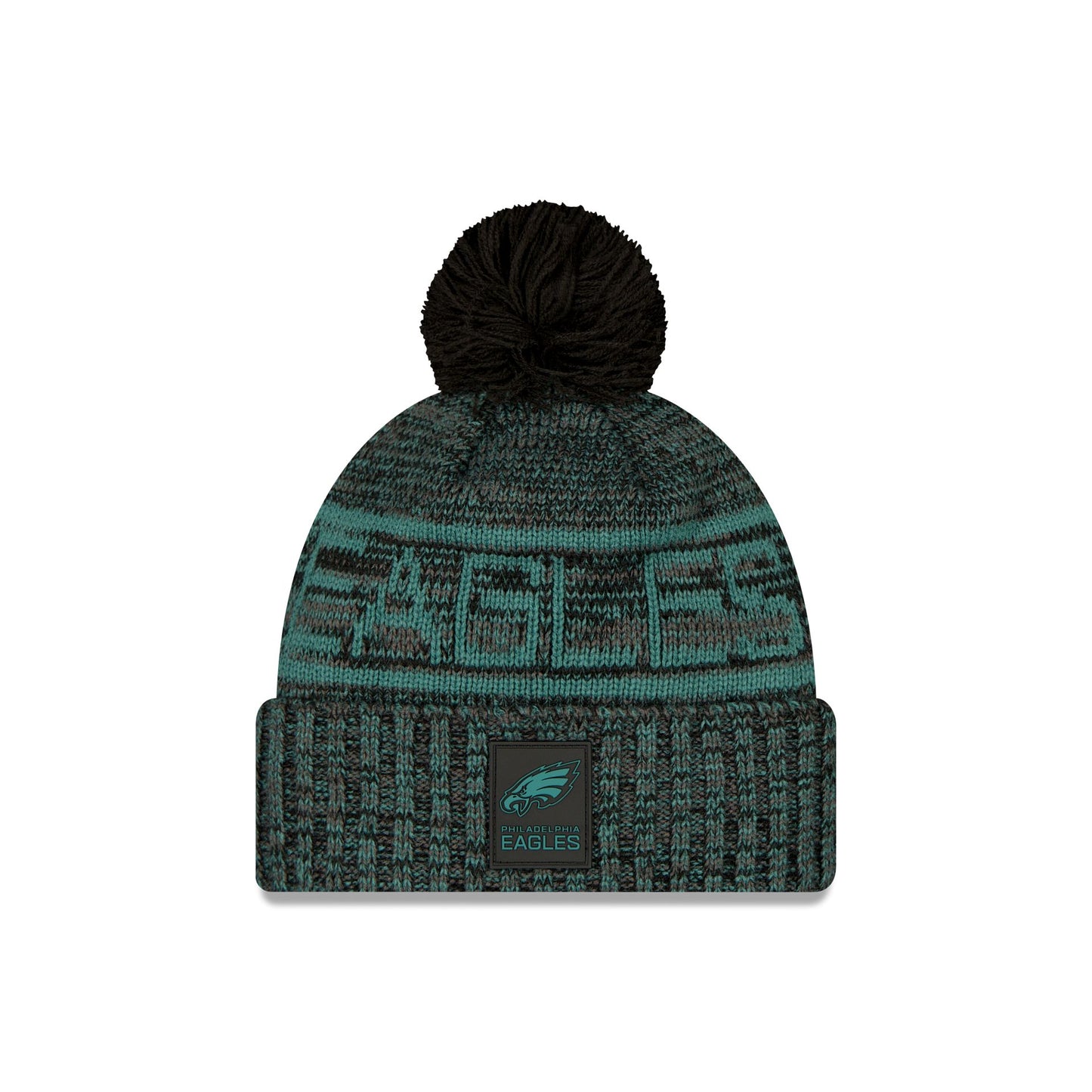 The Philadelphia Eagles 2025 Sideline Cold Weather Black Pom Knit Hat features a sewn-down silicone Eagles black logo patch at the front cuff with a matching Official NFL Shield logo at the rear. Additional details include a team wordmark across the crown, a one-time removeable black pom, and a fleece lining.