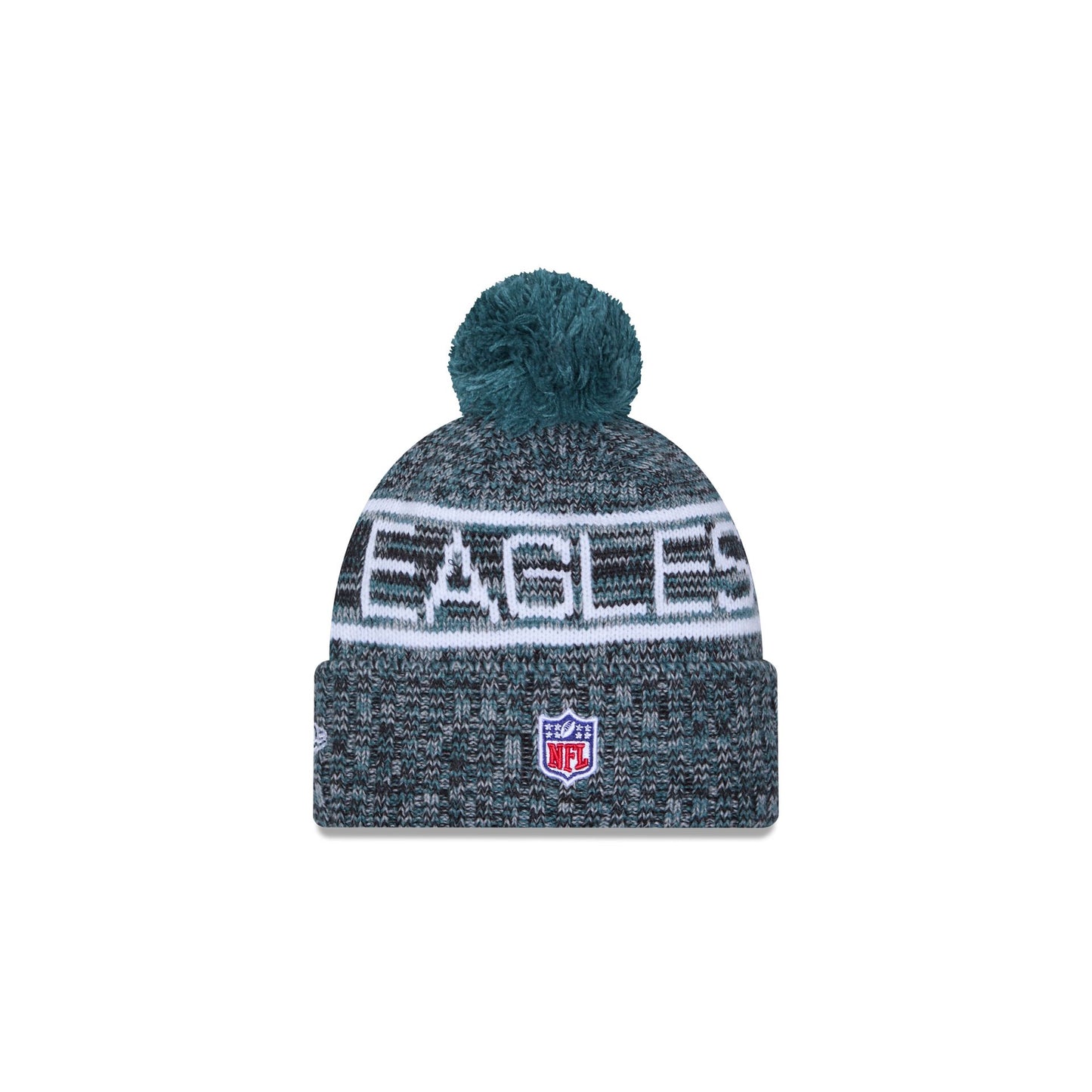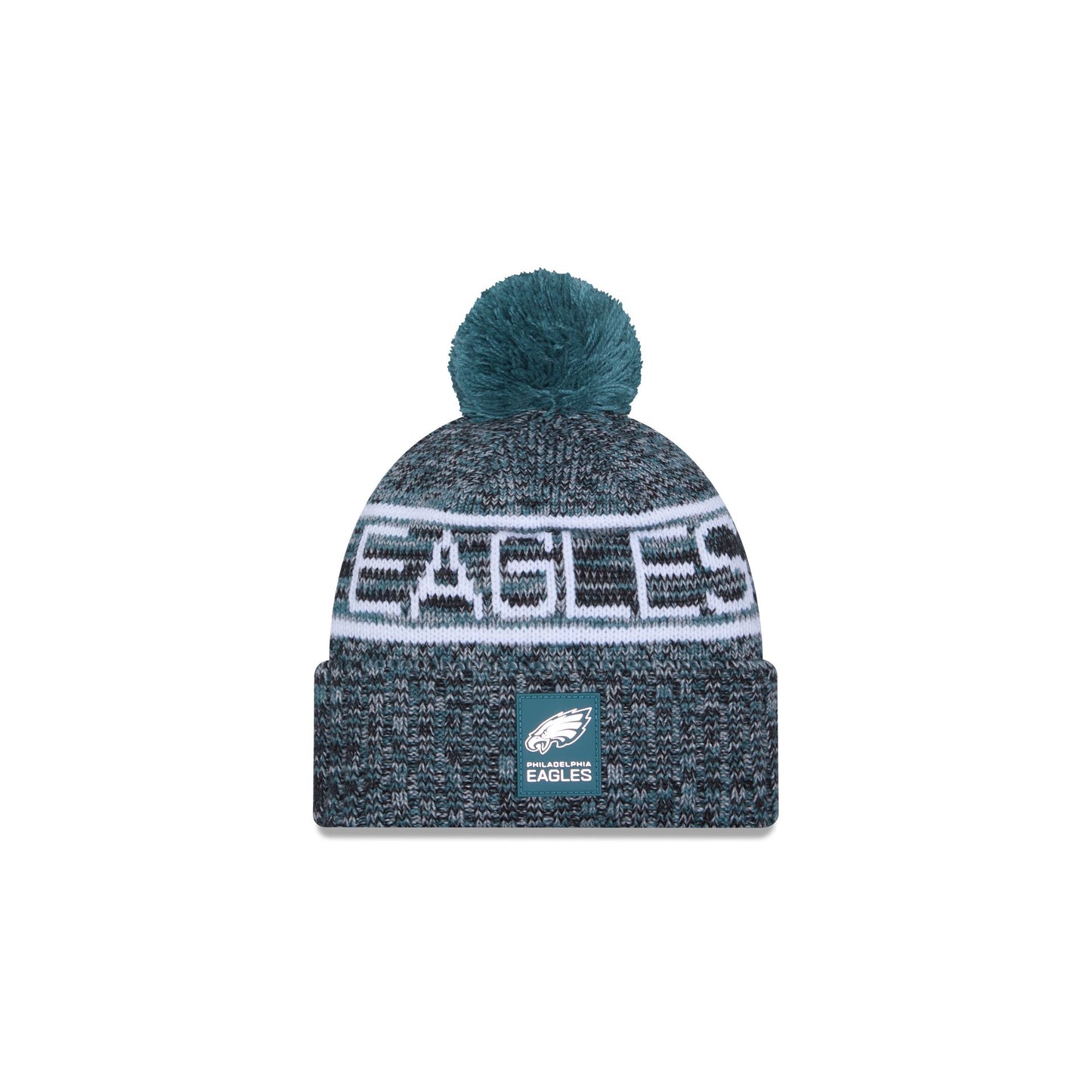 The Philadelphia Eagles 2025 Sideline Cold Weather Kids Pom Knit features a sewn-down silicone Eagles logo patch at the front cuff with a matching Official NFL Shield logo at the rear. Additional details include a team wordmark across the crown, a one-time removeable pom, and a fleece lining.