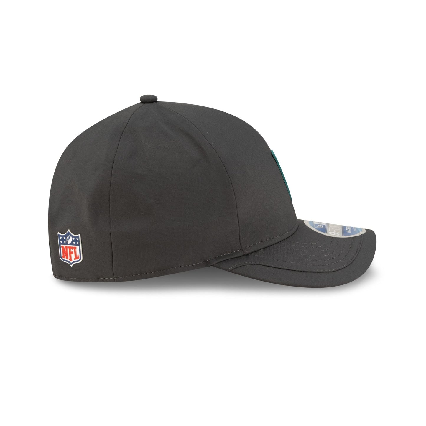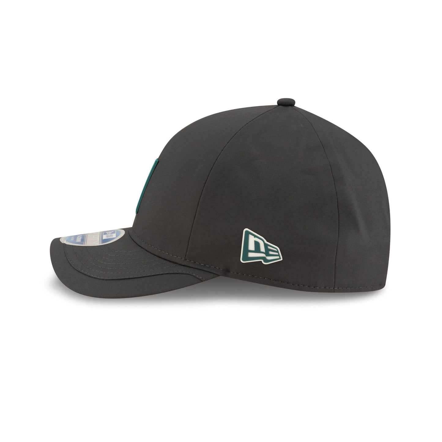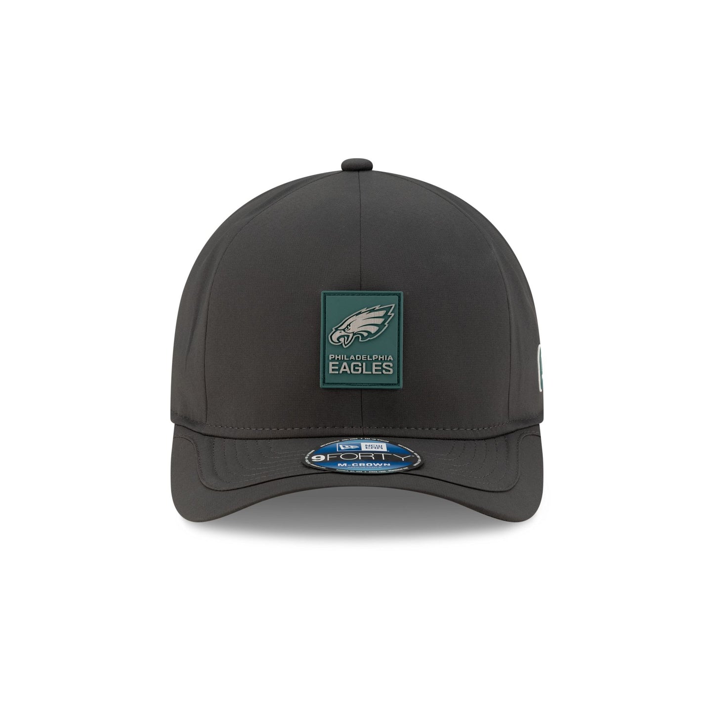 The Philadelphia Eagles 2025 Sideline Cold Weather Steel Clouds 9FORTY M-Crown Snapback features a sewn-down silicone Eagles logo patch at the front panels with a water-repellent quill tech fabrication throughout and a quick-dry cushioned sweatband to absorb moisture. Additional details include the Official NFL Shield logo to the right of a soft silicone snapback closure at the rear. The crown has bonded seams to trap warmth and the undervisor is accented with a silicone transfer in the team’s colors.