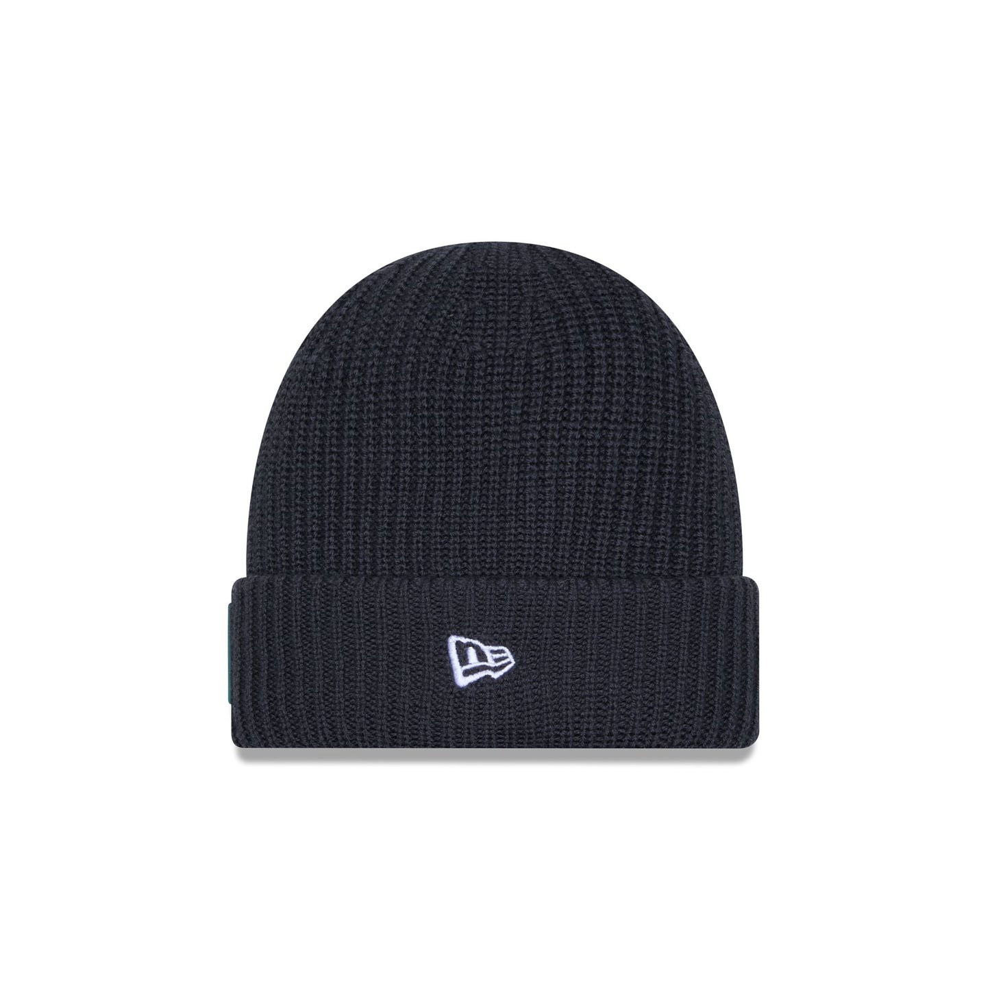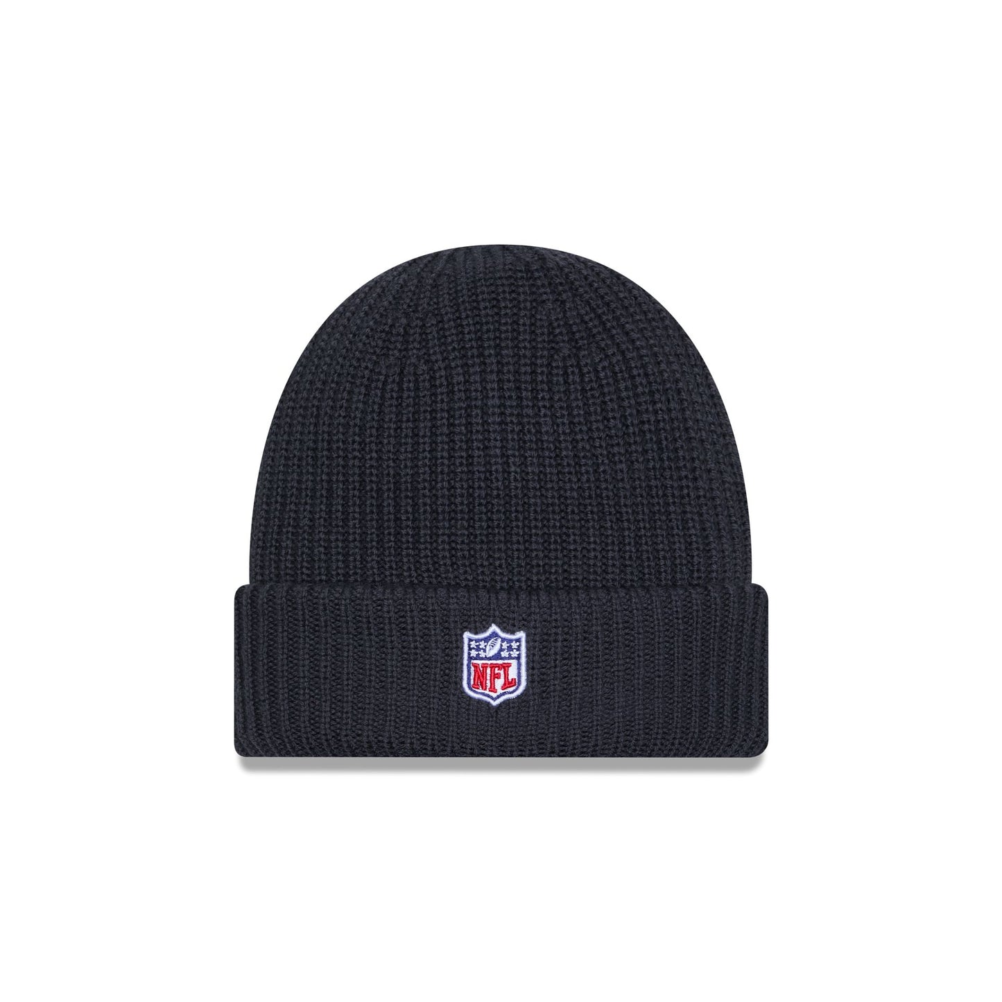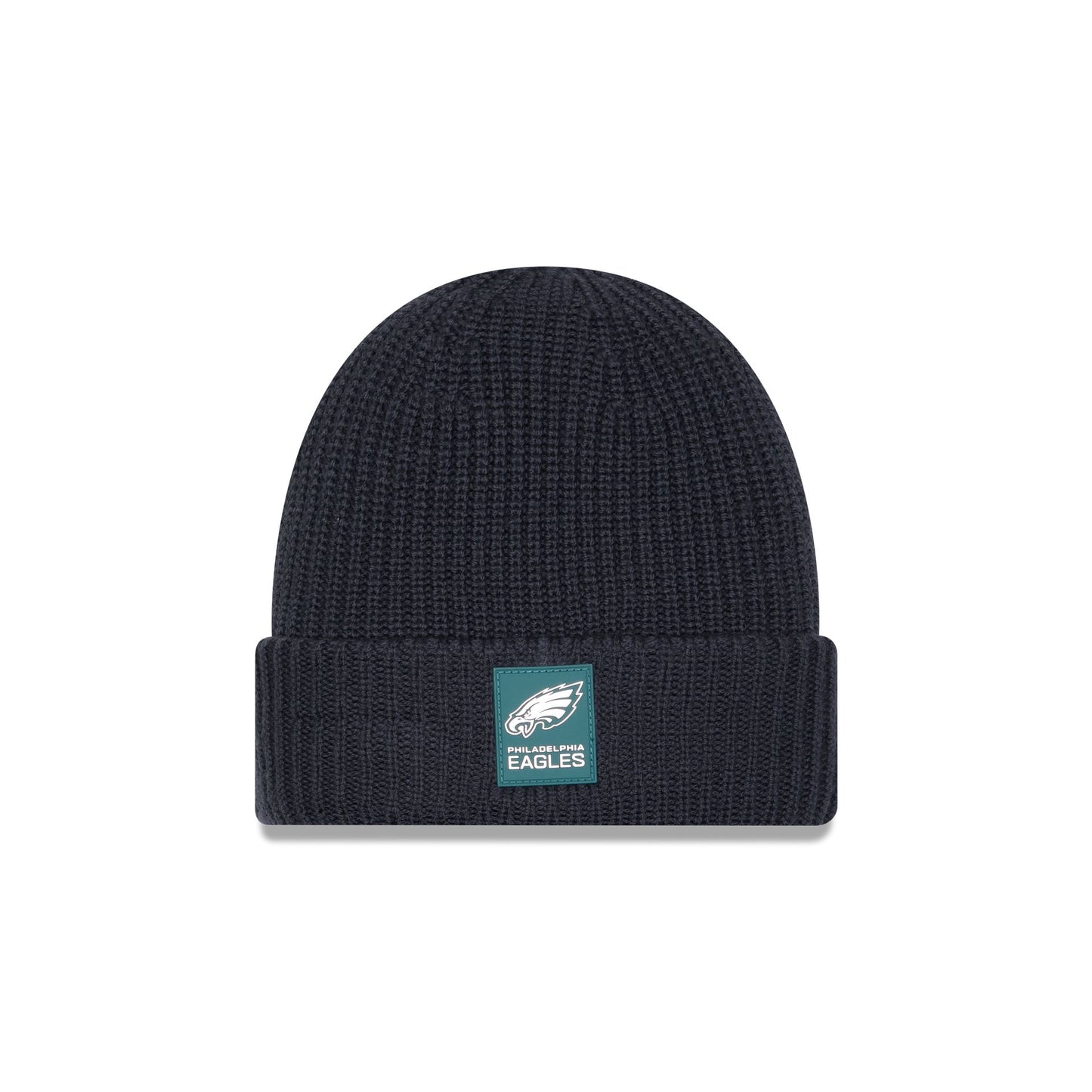 The Philadelphia Eagles 2025 Sideline Cold Weather Steel Clouds Cuff Knit Beanie features a sewn-down silicone Eagles logo patch at the front cuff with a matching Official NFL Shield logo at the rear. The beanie is knit from wool yarn and lined with fleece.