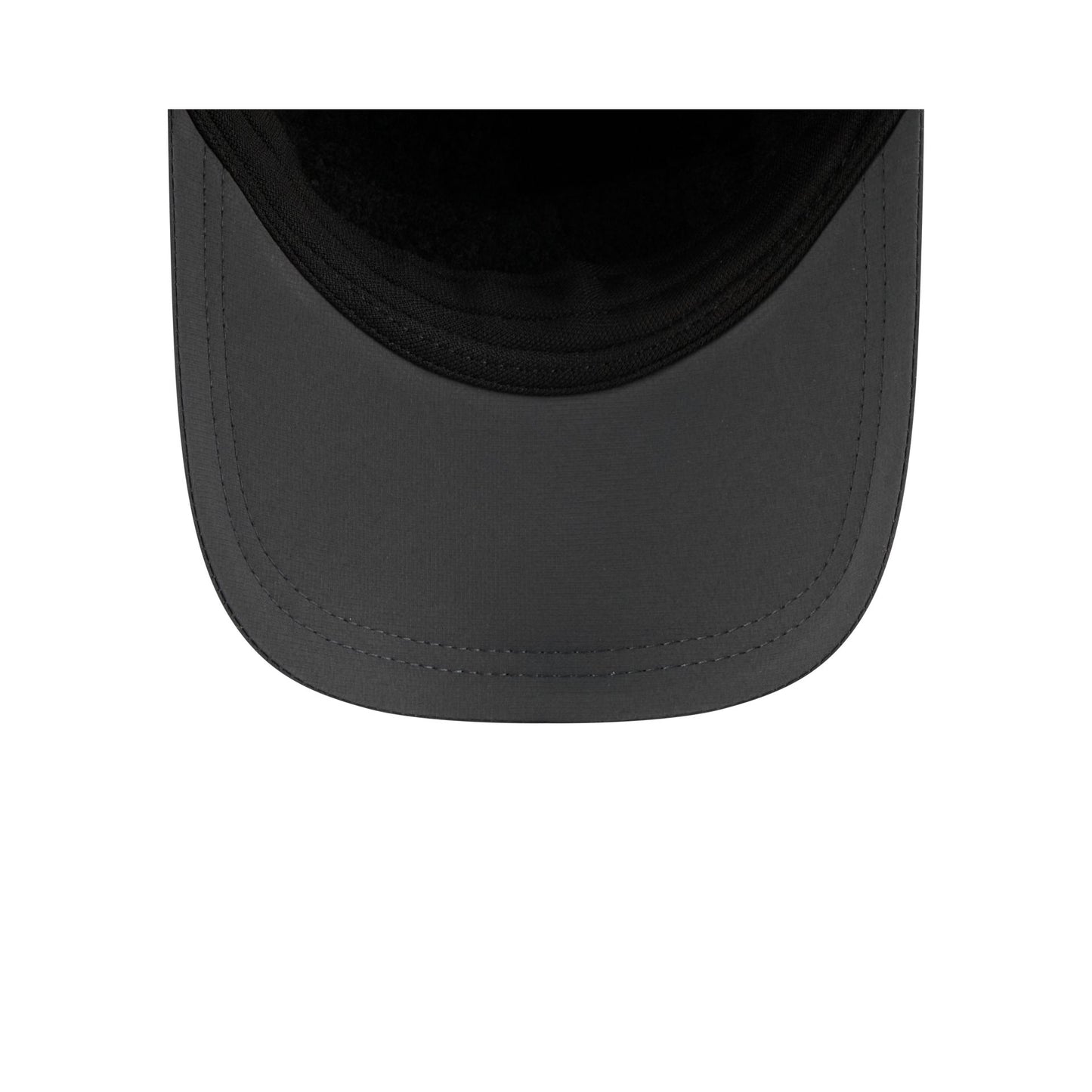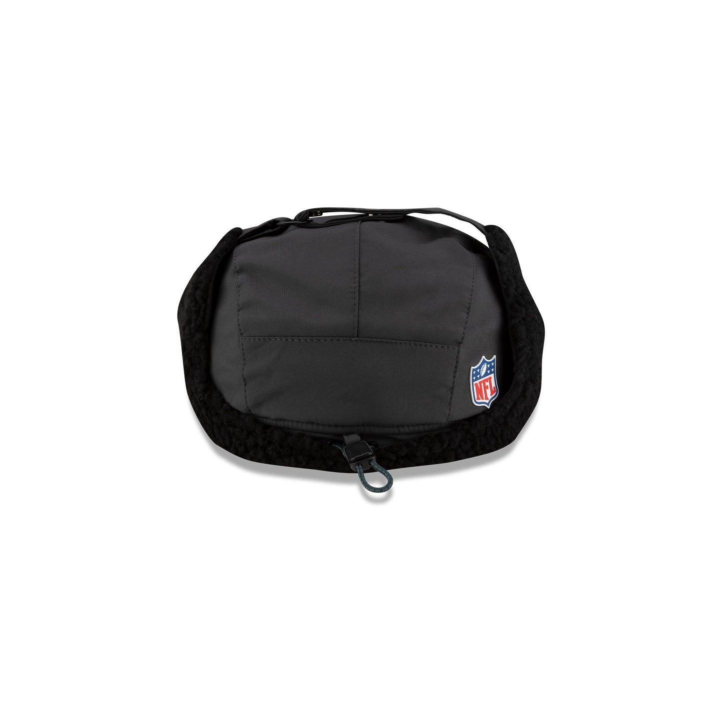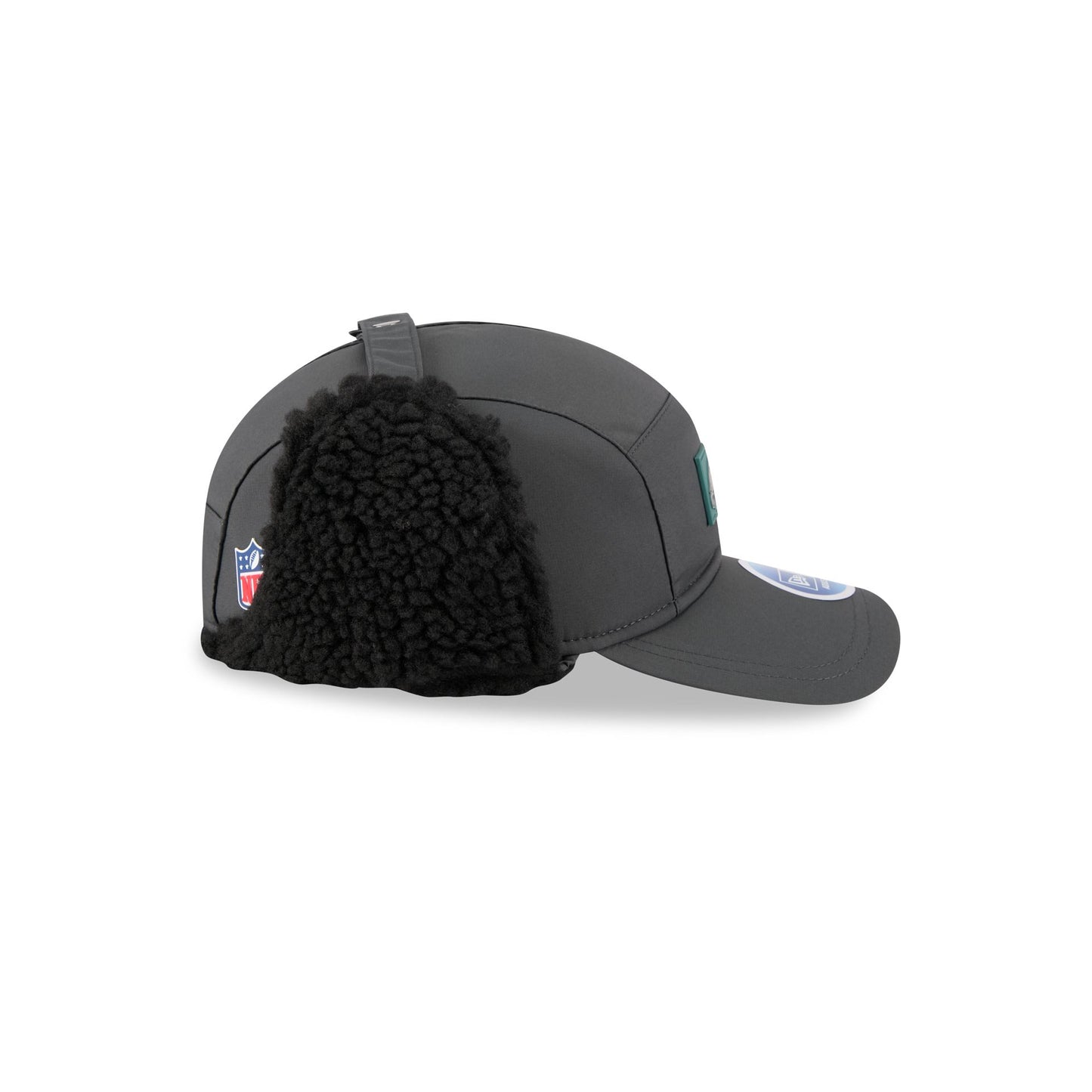The Philadelphia Eagles 2025 Sideline Cold Weather Steel Clouds Runner Dogear Adjustable Cap features a sewn-down silicone Eagles logo patch at the front panels with a water-repellent quill tech fabrication throughout with an insulated crown and sherpa lining. Additional details include a buckle strap button secured at the top of the crown that folds down to cover the ears, and an adjustable elastic toggle at the back for a customizable fit.