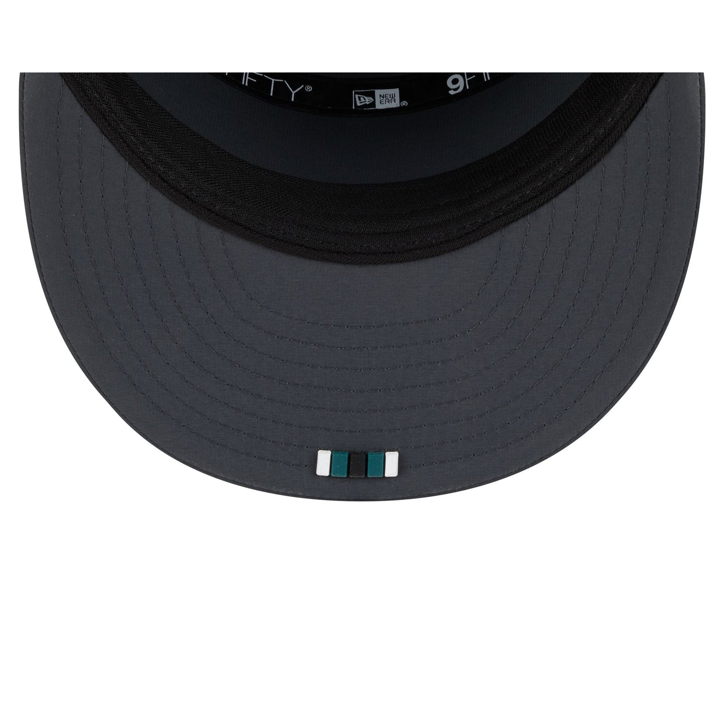The Philadelphia Eagles 2025 Sideline Cold Weather Steel Clouds Split Panel 9FIFTY Snapback features a sewn-down silicone Eagles logo patch at the front panels with a split-crown construction and diamond quilting. The cap has a water-repellent quill tech fabrication throughout, with a quick-dry cushioned sweatband to absorb moisture. Additional details include the Official NFL Shield logo to the right of a soft silicone snapback closure at the rear with eyelets at each side panel. The undervisor is accented with a silicone transfer in the team’s colors.
