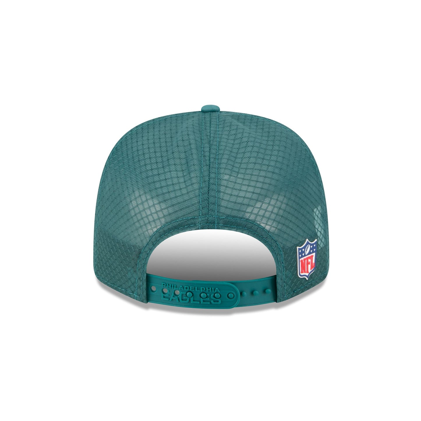 The Philadelphia Eagles 2025 Sideline Hot Weather 9SEVENTY Trucker features a sewn-down silicone Eagles logo patch at the front panels with a water-repellent quill tech fabrication throughout and a quick-dry cushioned sweatband to absorb moisture. Additional details include the Official NFL Shield logo to the right of a soft silicone snapback closure at a light-weight mesh rear. The undervisor is accented with a silicone transfer in the team’s colors.