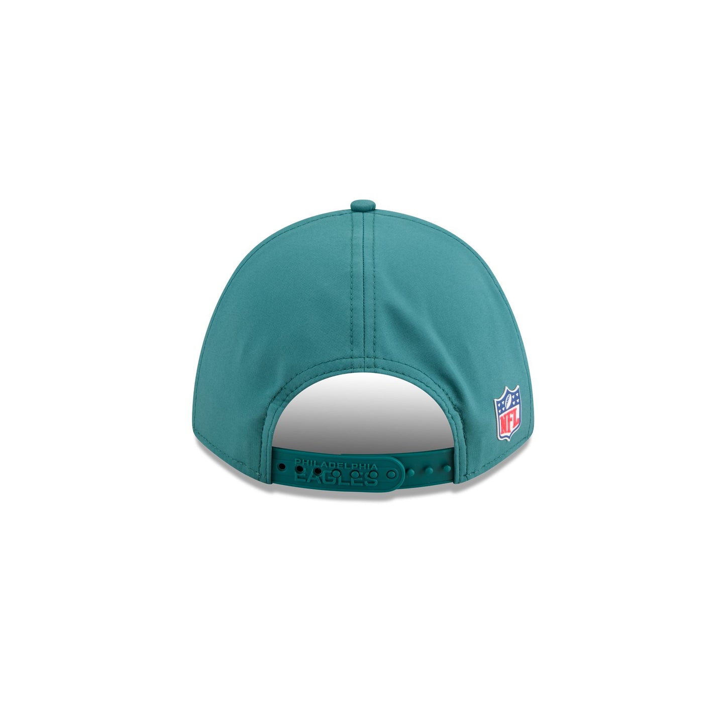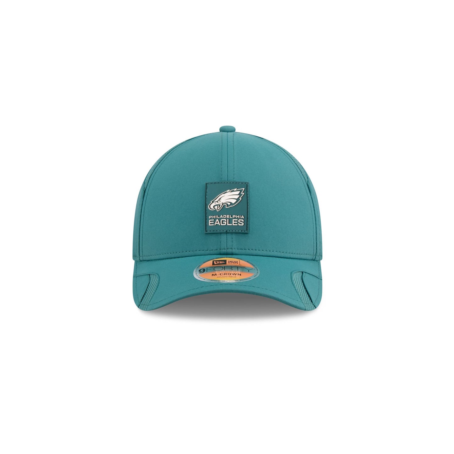 The Philadelphia Eagles 2025 Sideline Hot Weather Kids 9FORTY M-Crown Snapback features a sewn-down silicone Eagles logo patch at the front panels with a water-repellent quill tech fabrication throughout and a quick-dry cushioned sweatband to absorb moisture. Additional details include the Official NFL Shield logo to the right of a soft silicone snapback closure at the rear and mesh accents at the visor sides and side crown panels. The undervisor is accented with a silicone transfer in the team’s colors.