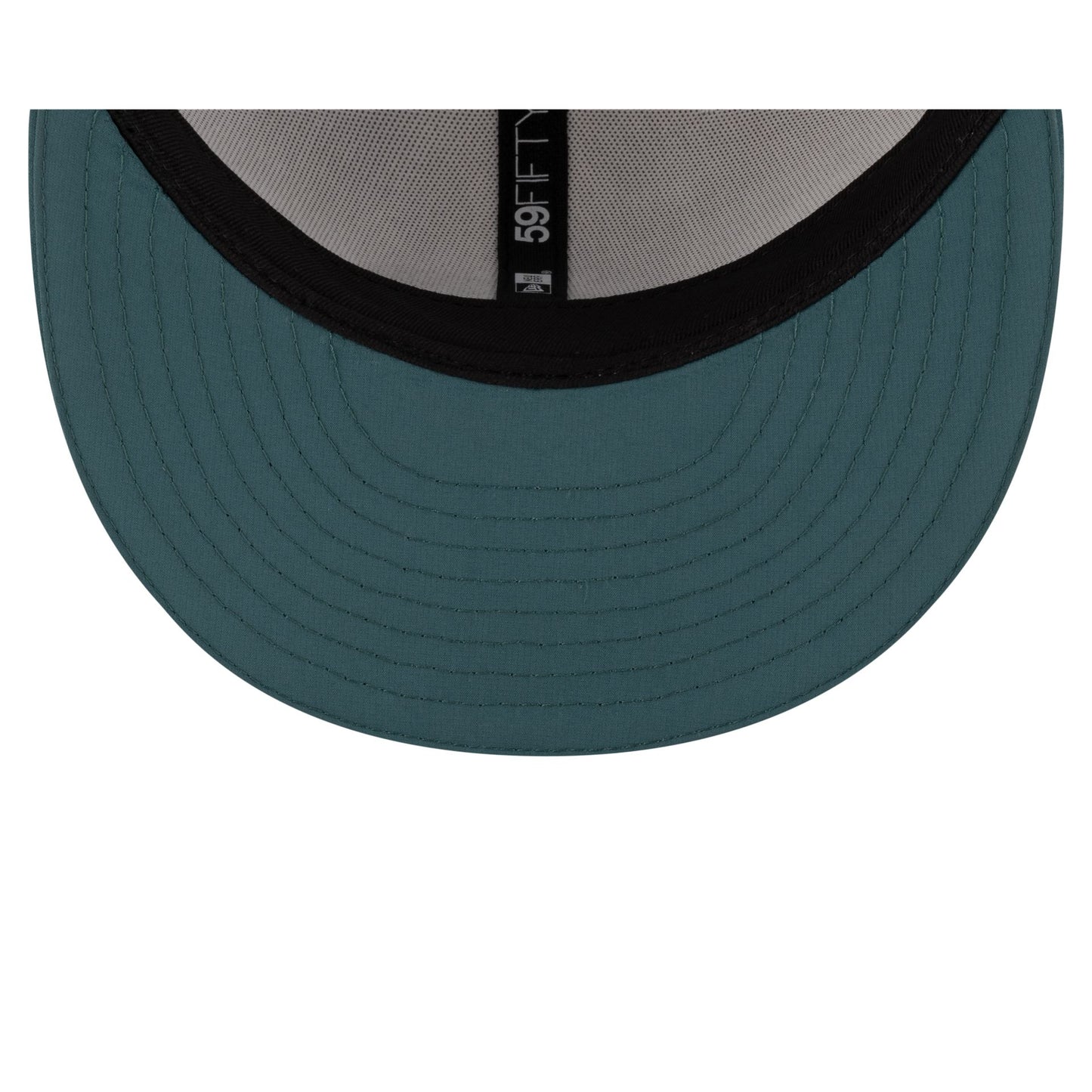 The Philadelphia Eagles 2025 Training 59FIFTY Fitted Cap features a silicone Eagles patch at the front panels with team color stripes at the front of a green visor and a silicone NFL Shield patch at the rear.