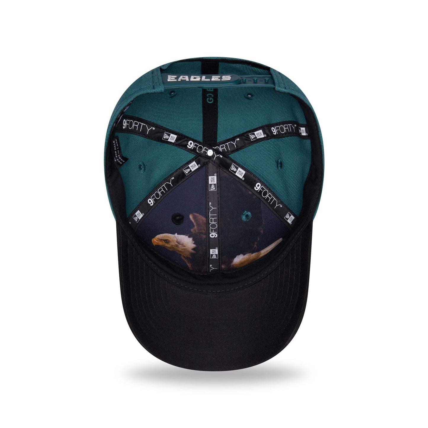 The Philadelphia Eagles 2026 Draft Kids 9FORTY M-Crown Snapback features a heat sealed liquid chrome Eagles patch and an Official 2026 NFL Draft pin at the front panels with an NFL Shield above a team wordmark on a snapback closure at the rear. Additional details include a city inspired interior fabrication with a Go Birds wordmark at the rear tape, a chrome New Era Flag at the left-wear side, and a black visor.