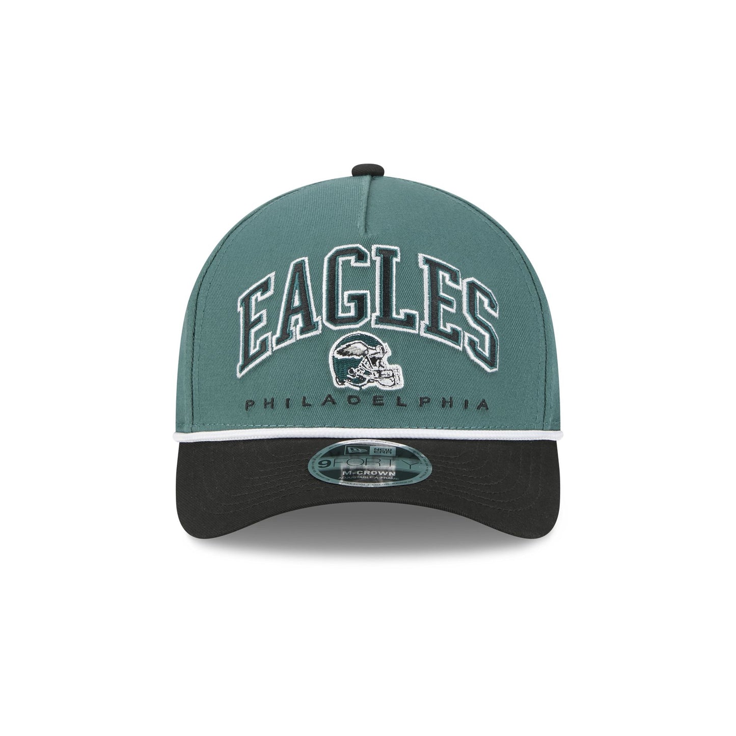 The Philadelphia Eagles Arch 9FORTY M-Crown A-Frame Snapback features an embroidered Eagles graphic at the front panels with a rope at the visor. Additional details include an adjustable snapback closure at the rear with a gray undervisor.