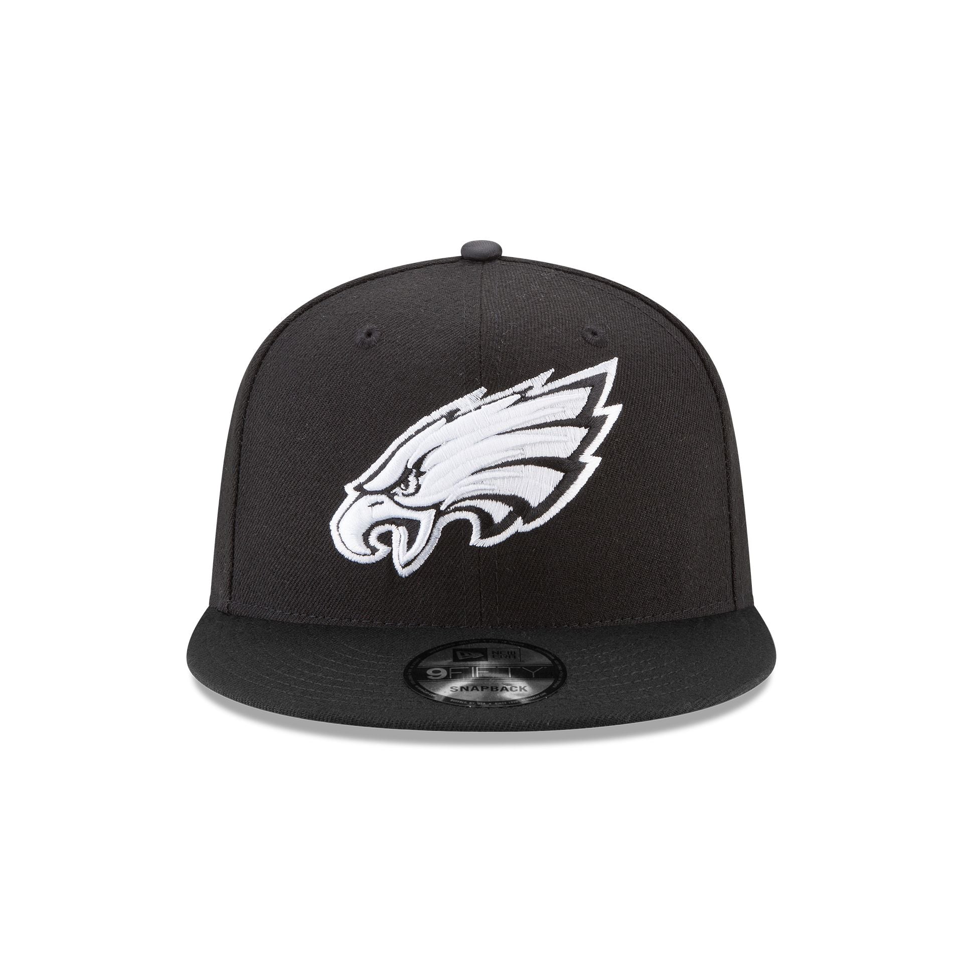 The Philadelphia Eagles Basic Black and White Snapback features an embroidered Eagles logo at the front panels with a snapback closure at the rear.