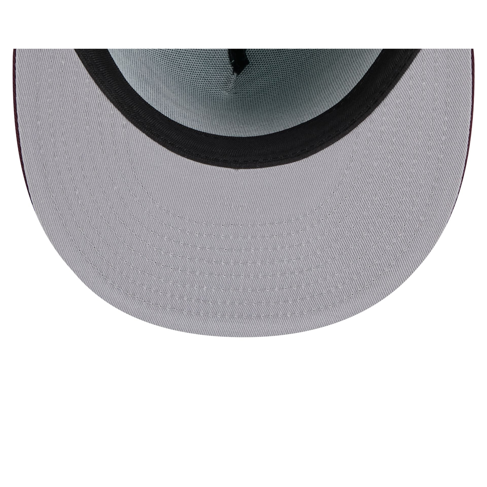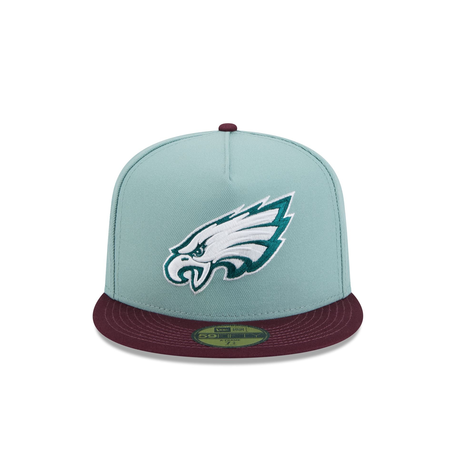 The Philadelphia Eagles Beach Kiss Blue 59FIFTY A-Frame Fitted Cap features an embroidered Eagles logo at the front panels with a matching NFL Shield at the rear. Additional details include a 75th Anniversary patch at the right-wear side and a gray undervisor.