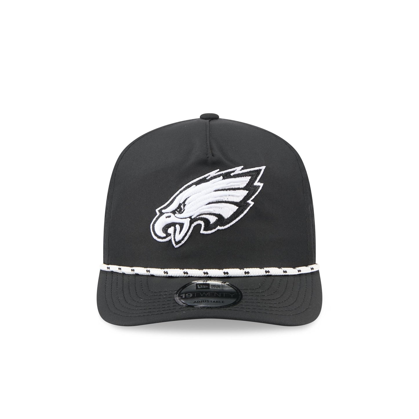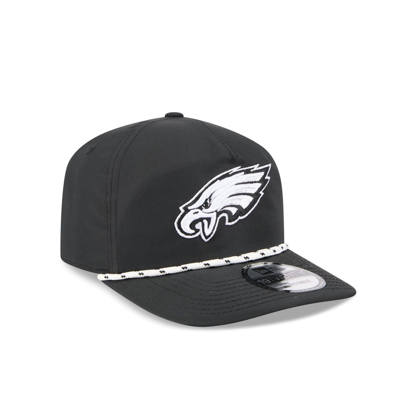 The Philadelphia Eagles Black and White Rope 19TWENTY Snapback features an embroidered Eagles logo and rope at the front with a snapback closure at the rear and a gray undervisor.