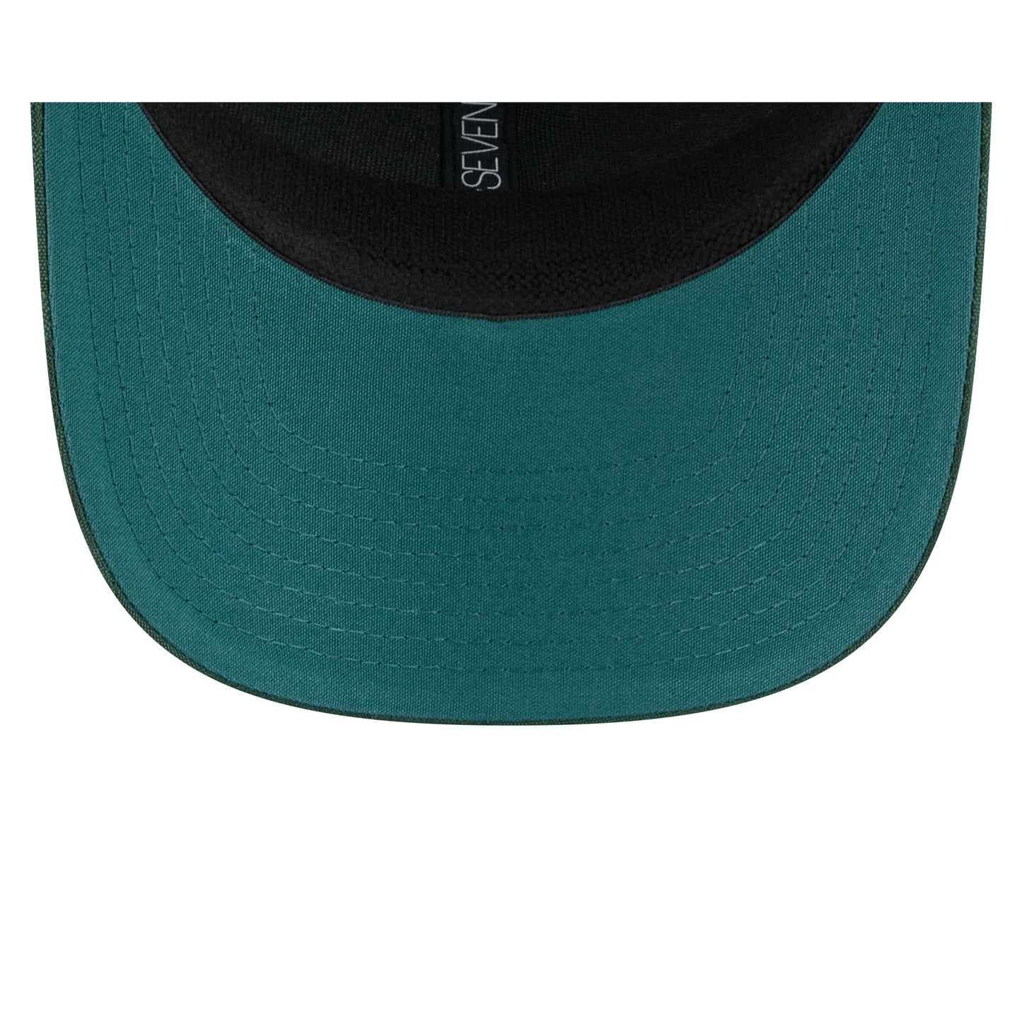 The Philadelphia Eagles Camo 9SEVENTY Trucker features an embroidered Eagles logo at the front panels with a matching New Era Flag at the left-wear side and a snapback closure at the rear.