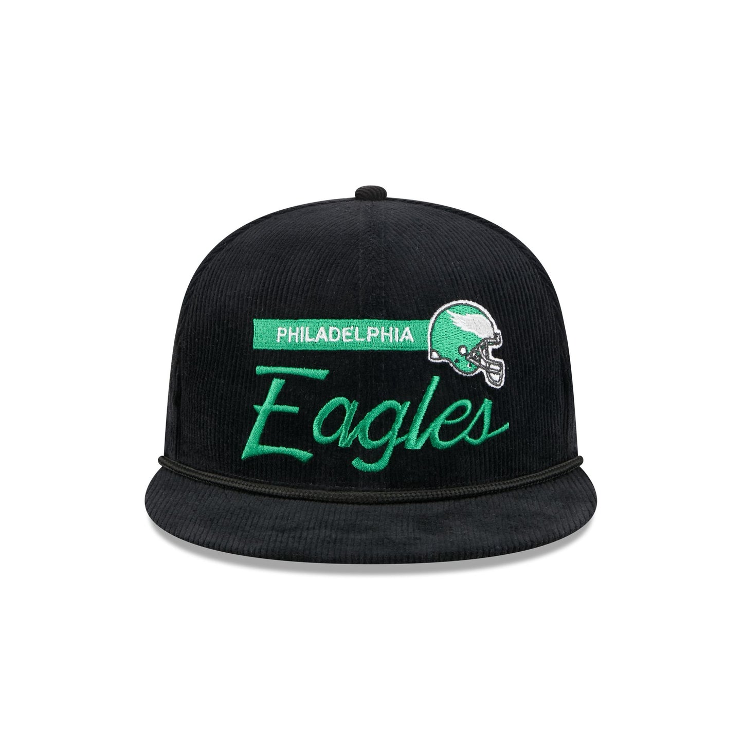 The Philadelphia Eagles Corduroy Rope 9FIFTY Snapback features an embroidered Eagles Historic graphic at the front panels with a corduroy fabrication throughout. Additional details include a rope at the visor, an adjustable snapback closure at the rear, and a gray undervisor.