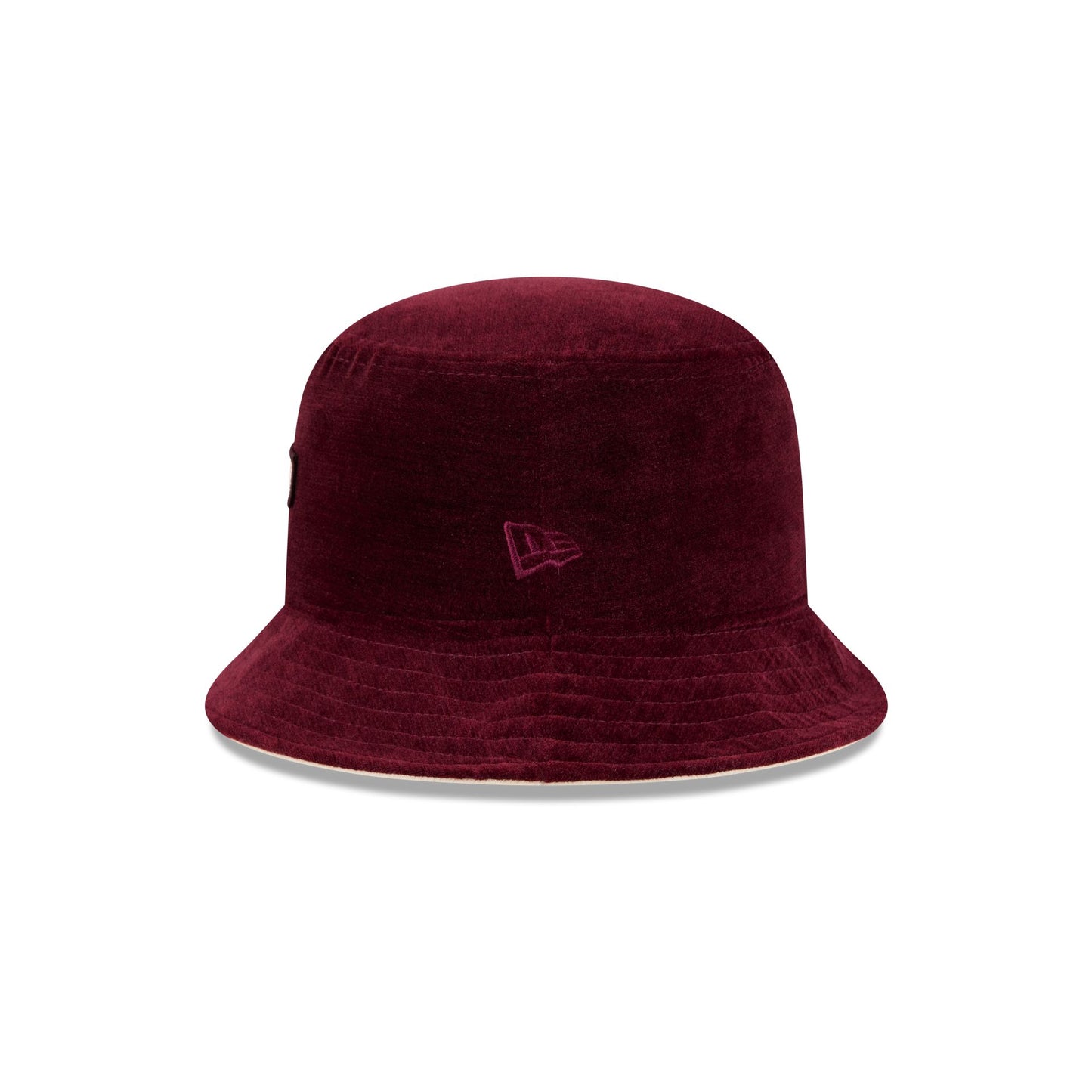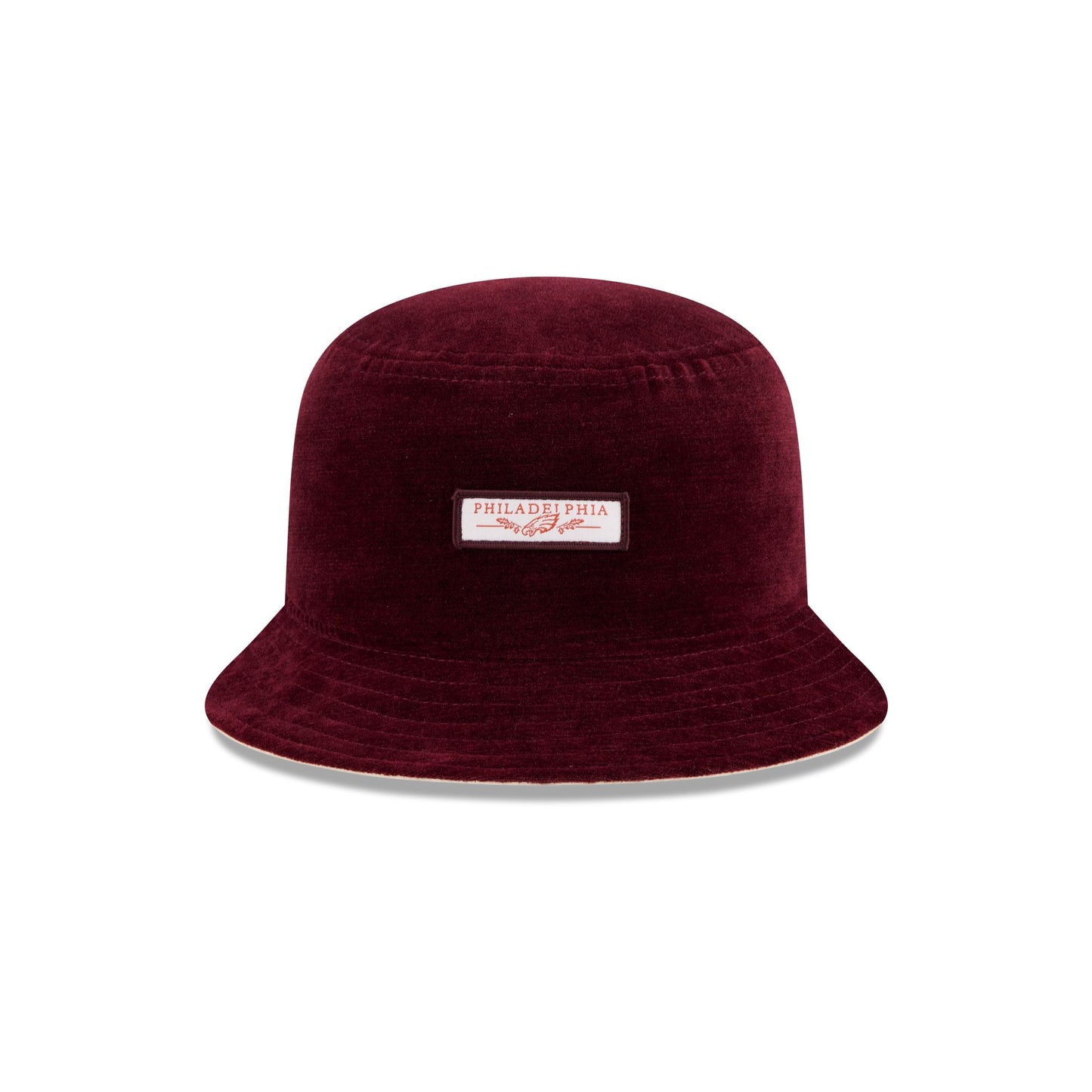 The Philadelphia Eagles Fall Velvet Bucket Hat features a woven Eagles tag at the front with a red velvet fabrication throughout.