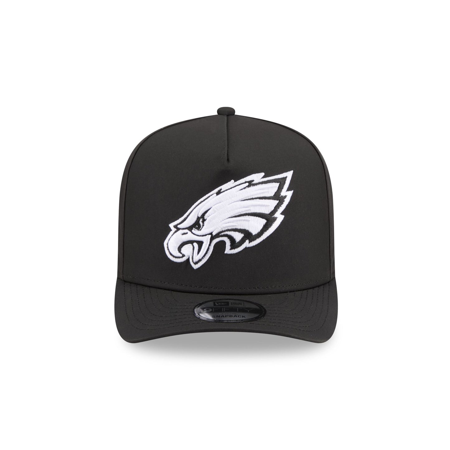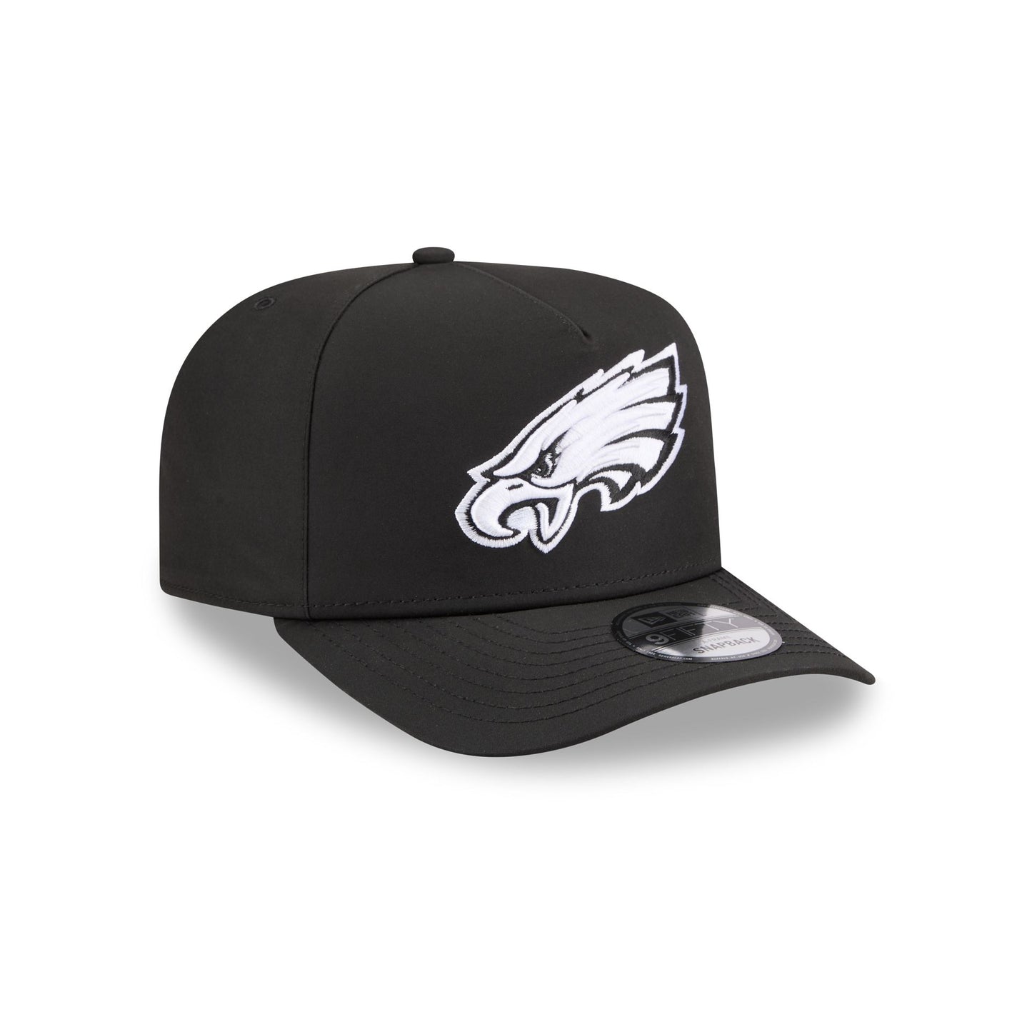 The Philadelphia Eagles GORE-TEX Black 9FIFTY A-Frame Snapback features an embroidered white Eagles logo at the front panels with a metallic sheen silicone New Era Flag logo and GORE-TEX logo at the left-wear side. Additional details include an adjustable snapback closure at the rear, a gray undervisor, and a polyester fabrication throughout the cap. It is waterproof, breathable, and lightweight.