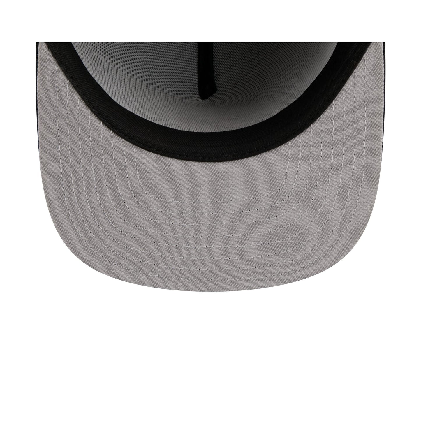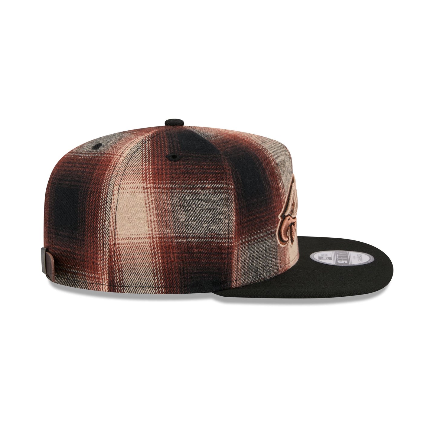 The Philadelphia Eagles Grunge Plaid 9FIFTY A-Frame Adjustable Cap features an embroidered Eagles logo at the front panel with a matching wordmark above an adjustable metal clasp closure at the rear, a black visor, and a gray undervisor.
