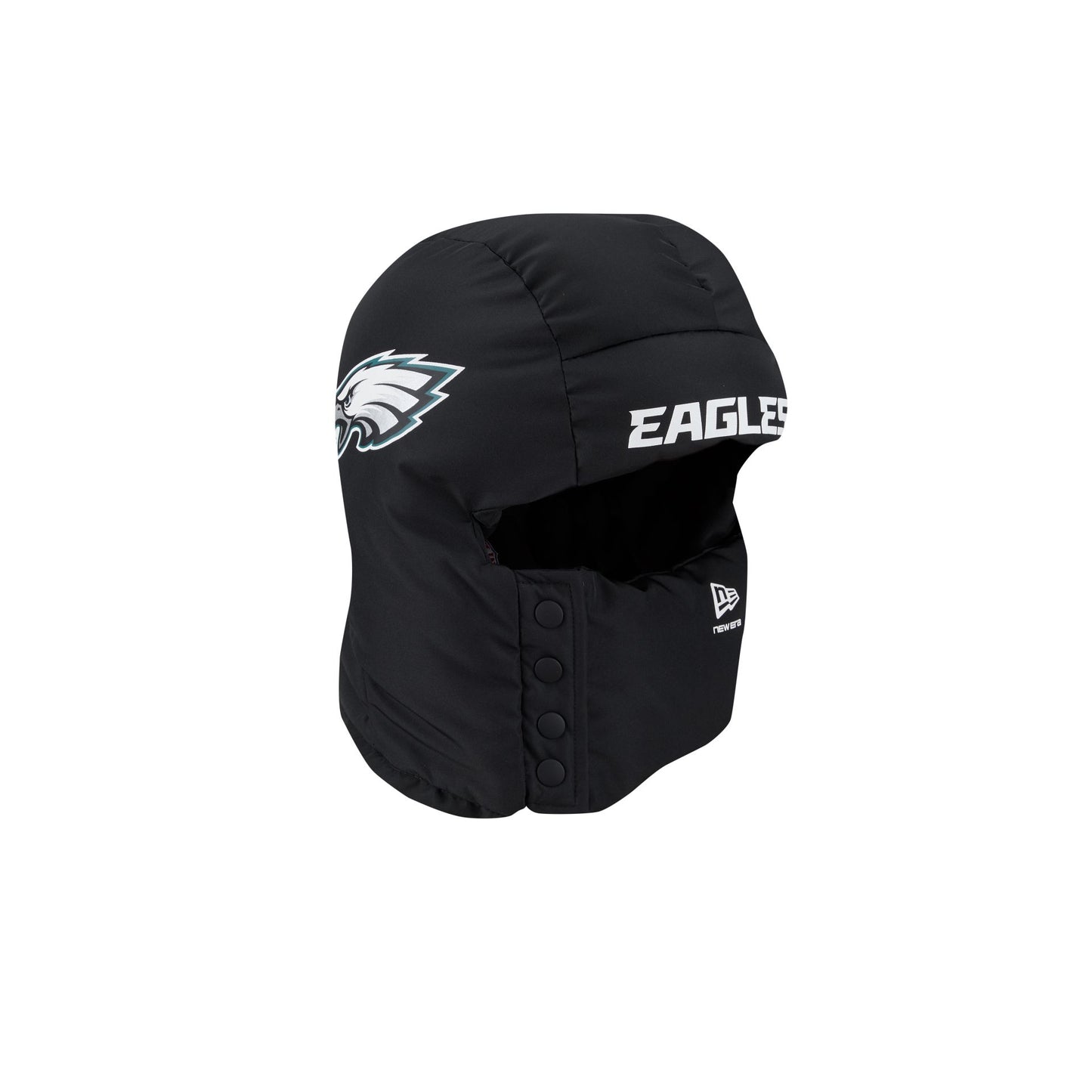 The Philadelphia Eagles Helmet Puffer Hood features an embroidered Eagles wordmark at the front with a helmet design at each side. Additional details include an insulated filling with adjustable drawstrings at the back of the head and neck. The puffer helmet has a 4 snap-button closure at the right.