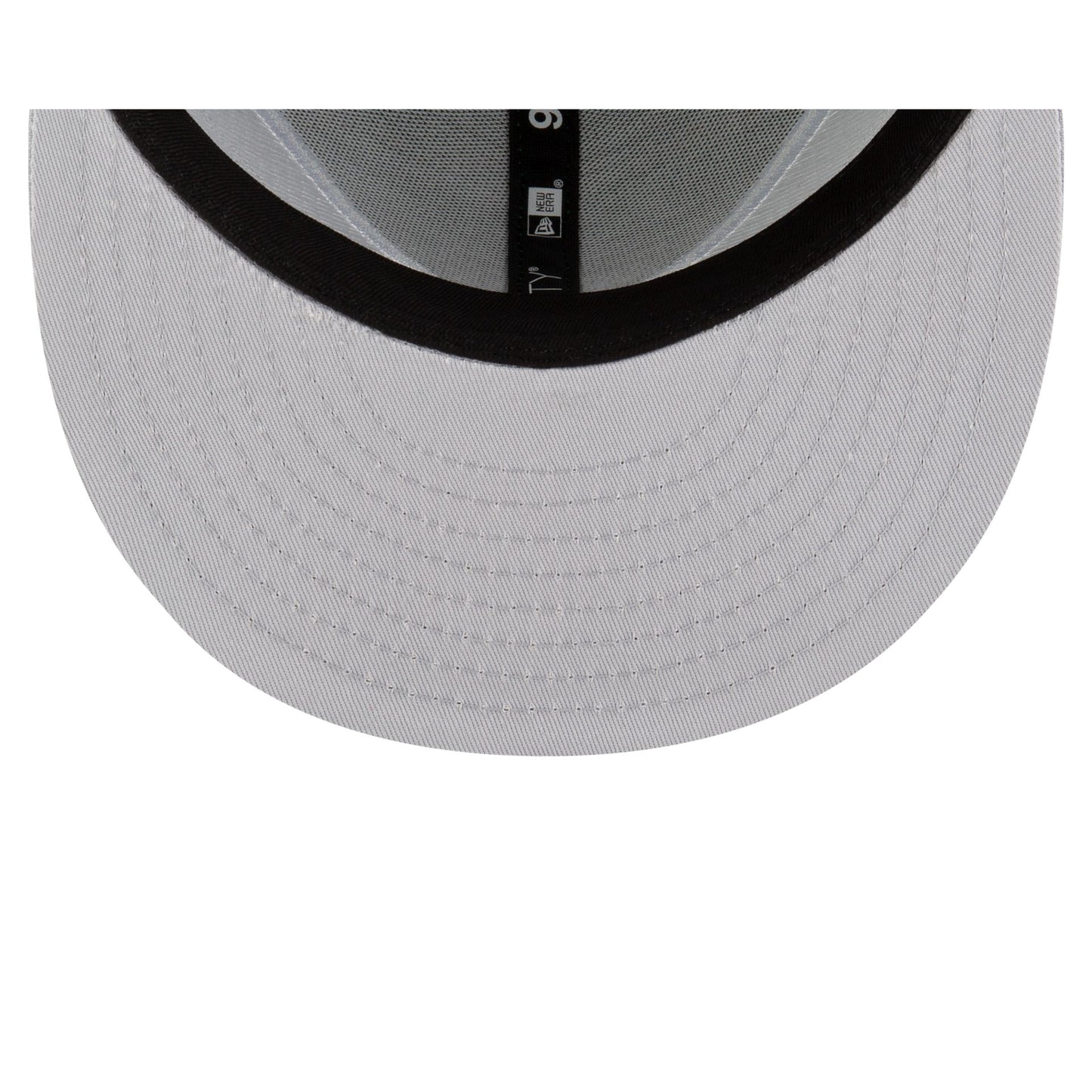 The Philadelphia Eagles Historic Helmet Pack 9FIFTY Snapback features an embroidered fabric applique Eagles replica helmet design at the crown with a matching woven team logo tag at an adjustable snapback closure at the rear and a gray undervisor.
