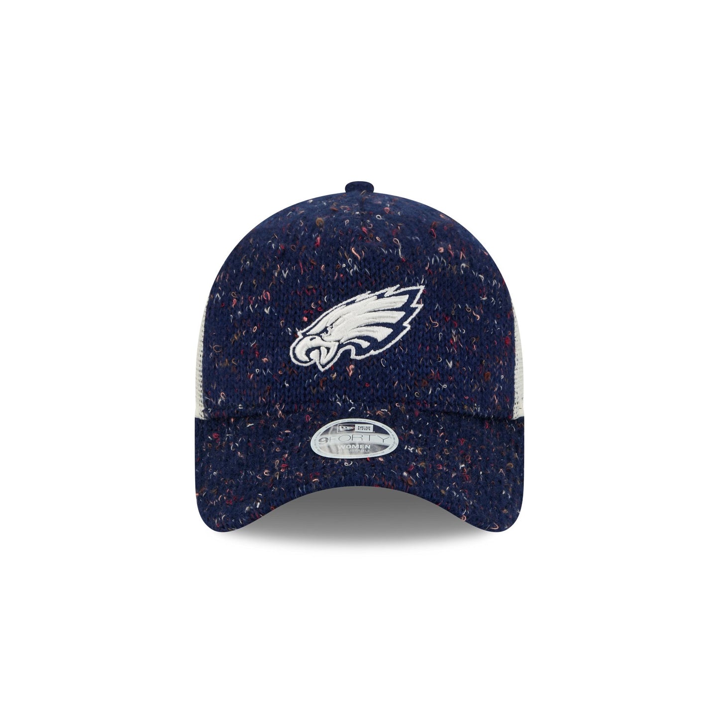 The Philadelphia Eagles Knit Women's 9FORTY A-Frame Trucker features an embroidered Eagles logo at the front knit panels. Additional details include a snapback closure at a mesh rear and white undervisor.