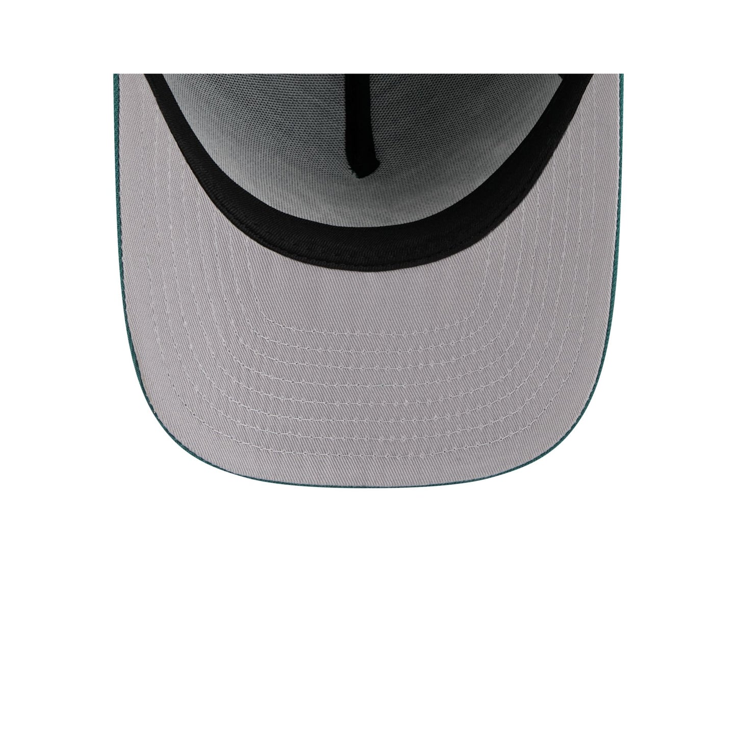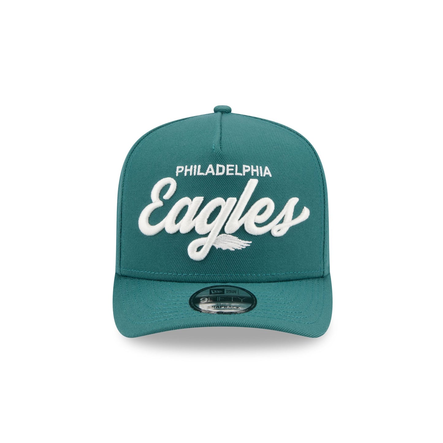 The Philadelphia Eagles Local Play 9FIFTY A-Frame Snapback features an embroidered Eagles themed script wordmark at the front panels with a logo at the right-wear side. Additional details include an adjustable snapback closure at the rear and a gray undervisor.