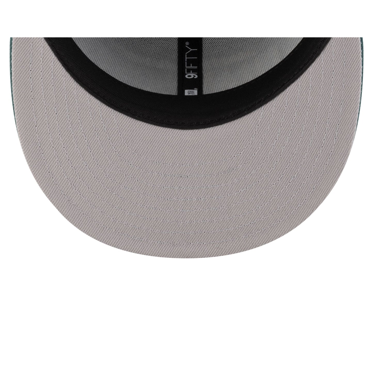 The Philadelphia Eagles Super Bowl LIX Champions 9FIFTY Snapback features an embroidered Super Bowl LIX Champions wordmark above an Eagles logo at the front panels. Additional details include a matching NFL Shield above an adjustable snapback closure at the rear and a gray undervisor.