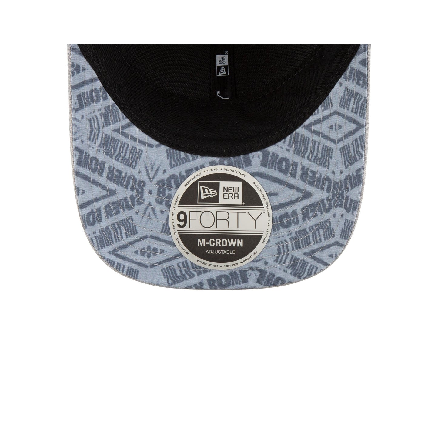 The Philadelphia Eagles Super Bowl LIX Sideline 9FORTY M-Crown Snapback features an embroidered Eagles logo at the front panels with the Official Super Bowl LIX patch at the right-wear side, the NFL Shield above a snapback closure at the rear, and a Super Bowl patterned undervisor.