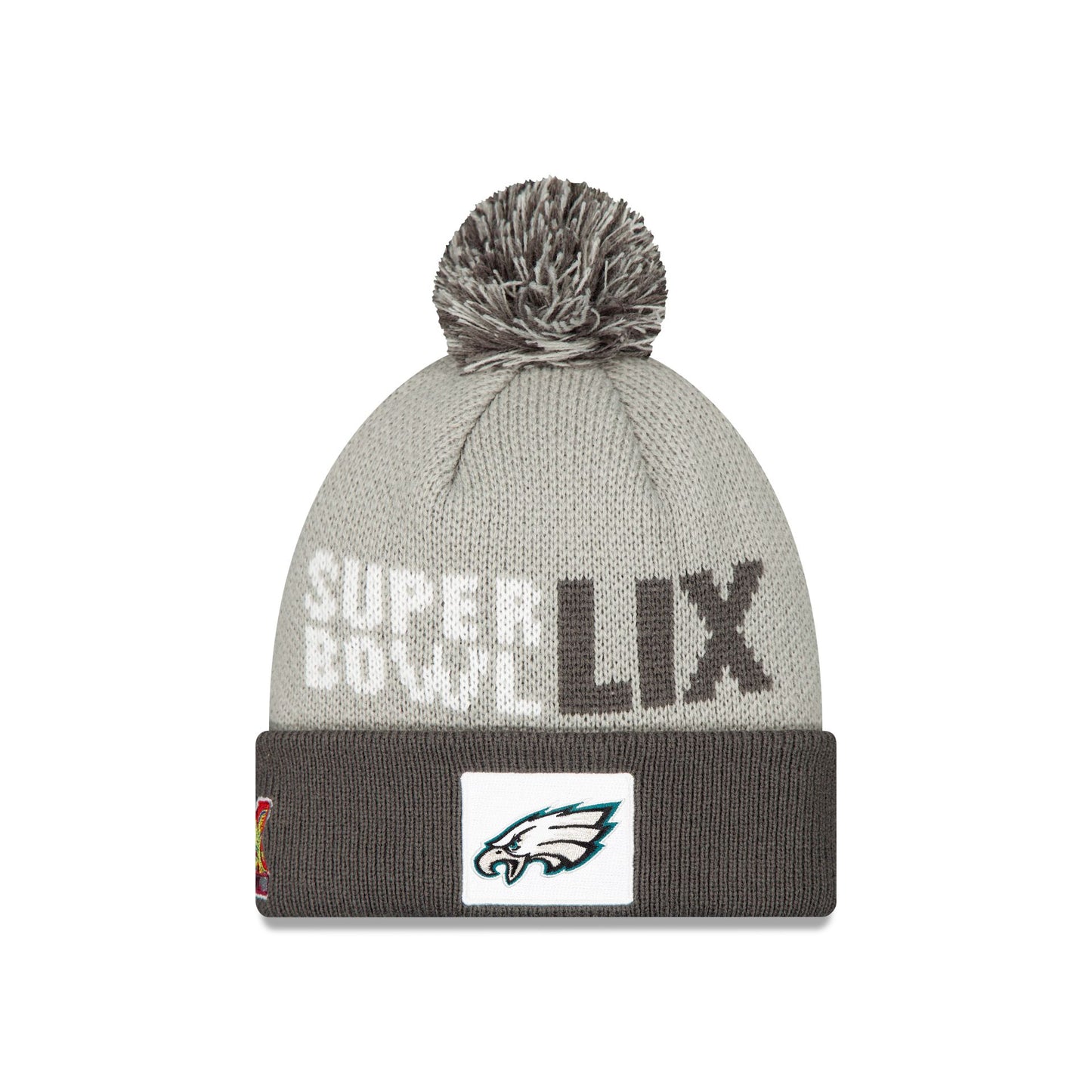 The Philadelphia Eagles Super Bowl LIX Sideline Pom Knit features an embroidered Eagles logo at the front with the NFL Shield at the rear. Additional details include the Official Super Bowl LIX patch at the right-wear side with a matching wordmark at the crown and a one-time removable pom.