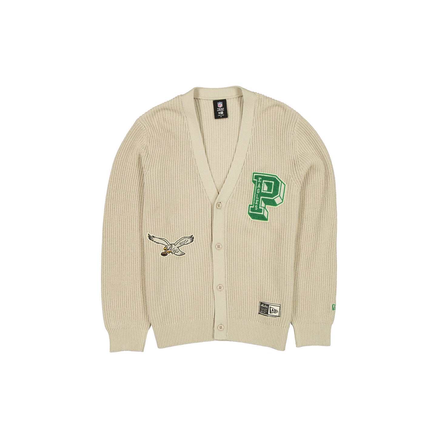 The Philadelphia Eagles Throwback Prep Stone Cardigan features an embroidered Eagles logo at the right waist with a twill applique letters at the left chest and a button closure.