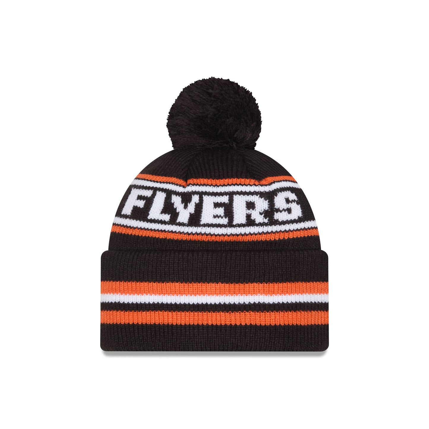 The Philadelphia Flyers Classic Pom Knit Hat features an embroidered Flyers logo at the front cuff with a wordmark at the crown and a one-time removable pom.