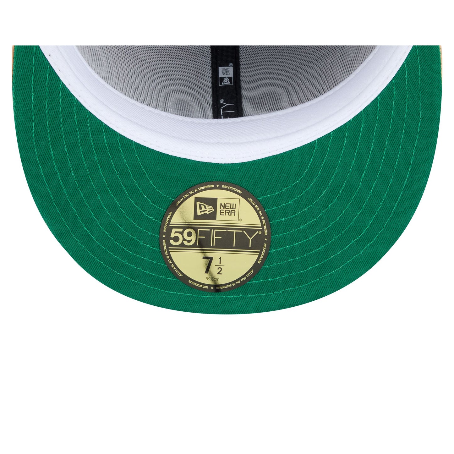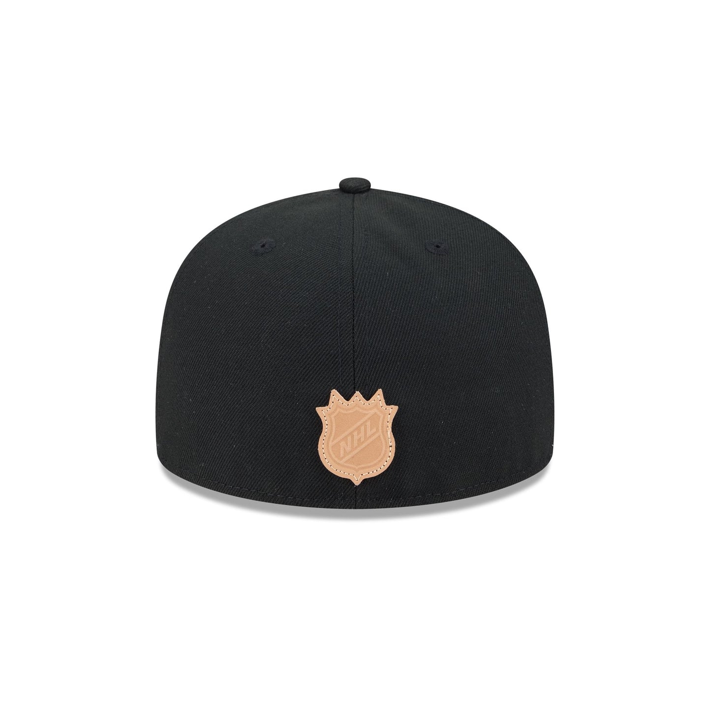 The Philadelphia Flyers Leather Visor 59FIFTY Fitted Cap features an embroidered Flyers logo at the front panels with a cream leather visor. Additional details include an NHL Shield logo at the rear and a green undervisor with leather accents throughout.