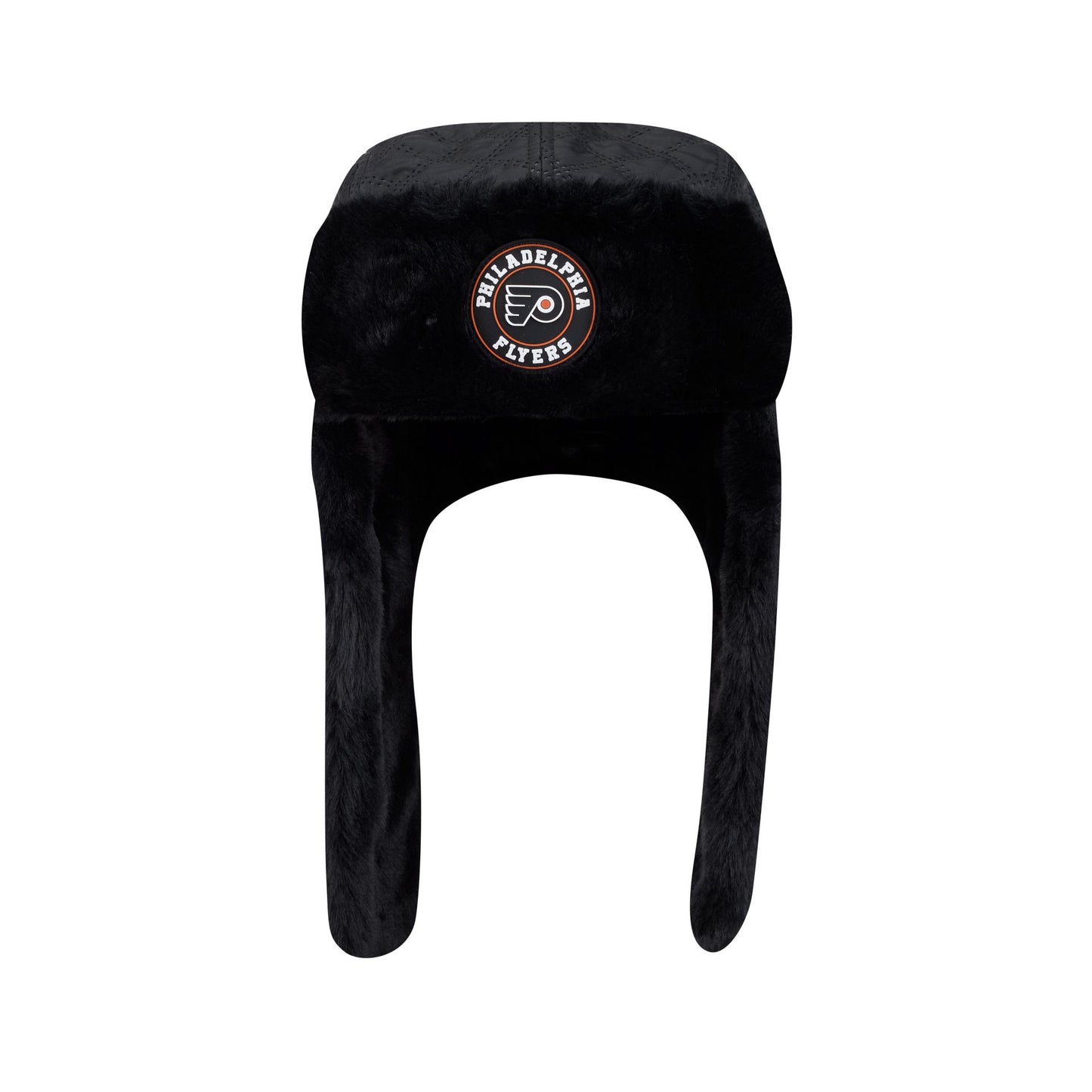 The Philadelphia Flyers Quilted Fashion Trapper features a silicone Flyers circle logo at a faux fur shield with snap dog ears. Additional details include a faux fur interior and a quilted stitching.