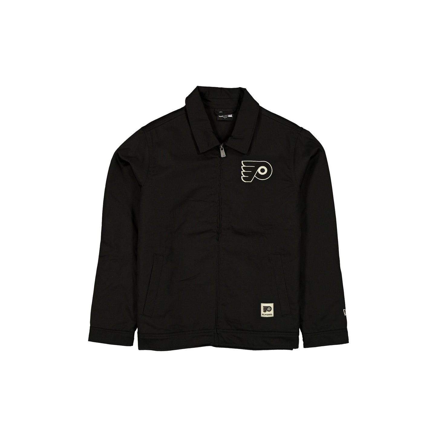 The Philadelphia Flyers Quilted Jacket features a chain stitch embroidered Flyers logo at the left chest with a matching team jock tag at the left slit pocket. Additional details include a full-zip closure with an interior pocket at the chest and adjustable snap button straps at the rear hem.