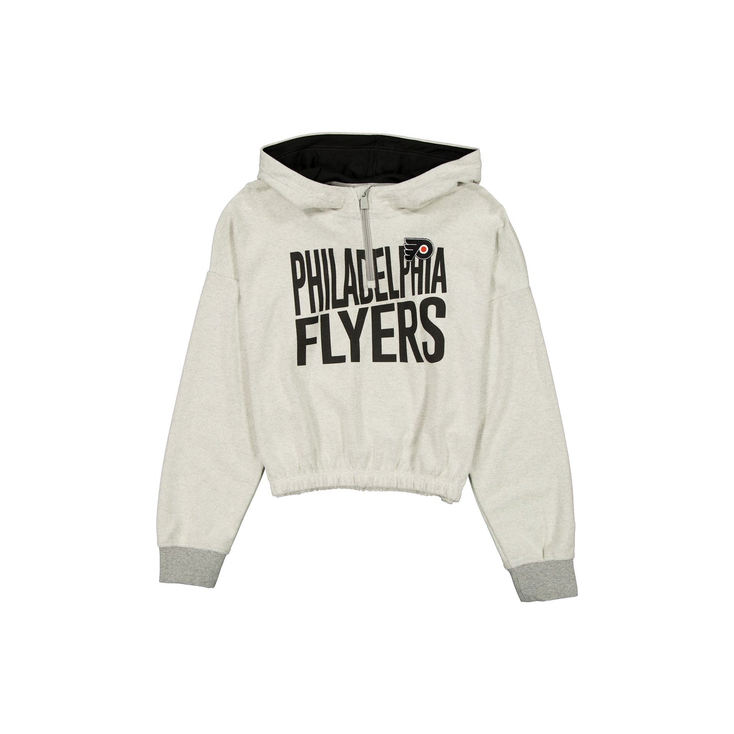 The Philadelphia Flyers Sport Night Heather Gray Women's Hoodie features a screen-printed Flyers wordmark at the front with an embroidered team logo at the left chest. Additional details include a quarter-zip closure and an elastic waistband.