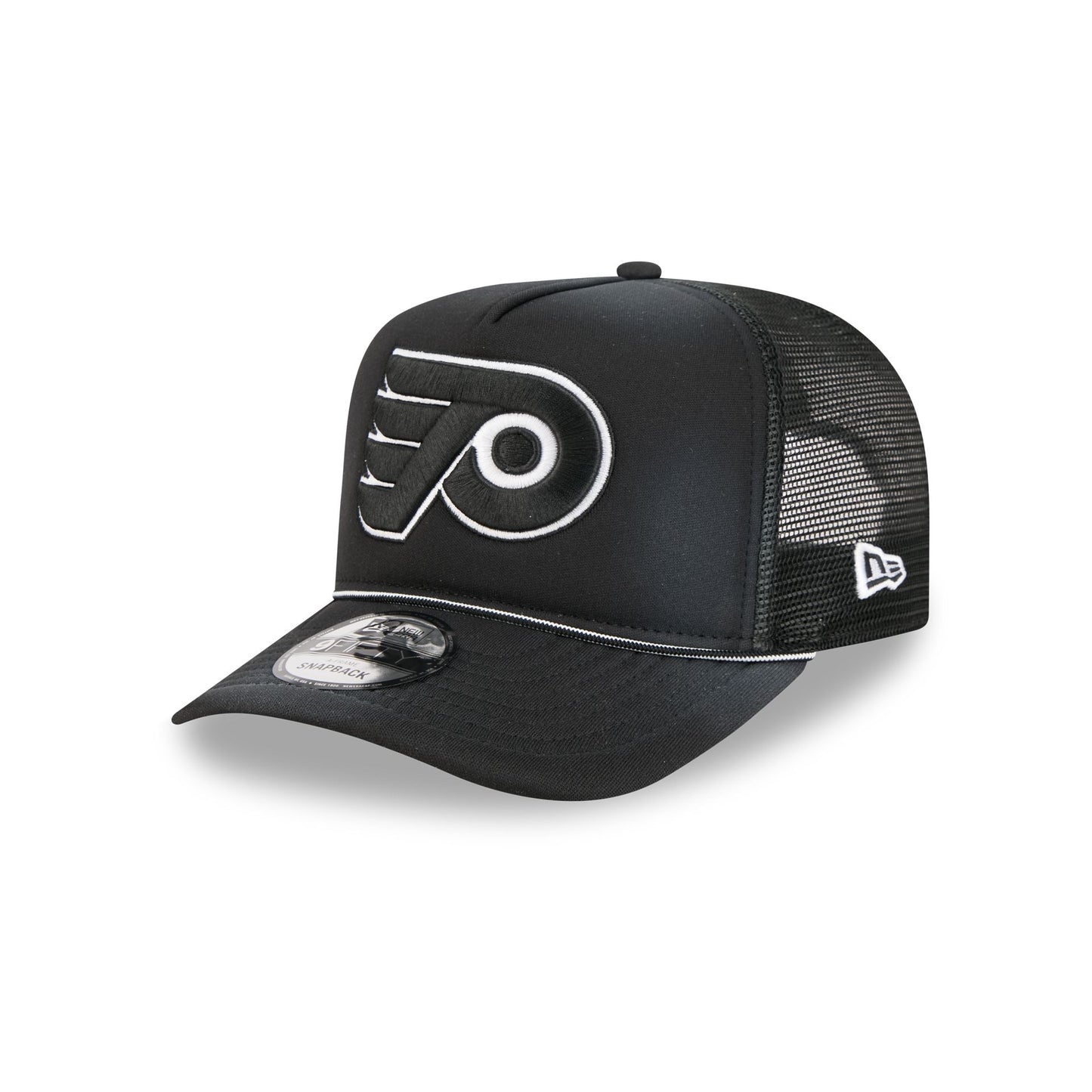 The Philadelphia Flyers Washed Black 9FIFTY A-Frame Trucker features an embroidered white Flyers logo at the front panels set against a soft, washed fabrication throughout. Additional details include a rope at the visor, an adjustable snapback closure at the rear, and a gray undervisor.