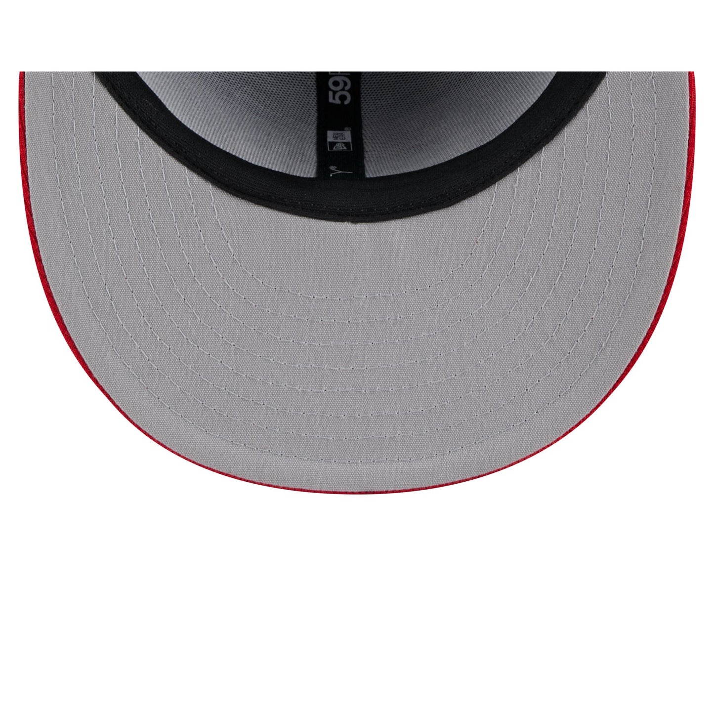 The Philadelphia Phillies 2025 Batting Practice 59FIFTY Fitted Cap features an embroidered Phillies logo at the front panels with a matching MLB Batterman logo at the rear. Additional details include a pivot knit fabrication, a red visor, and a gray undervisor.