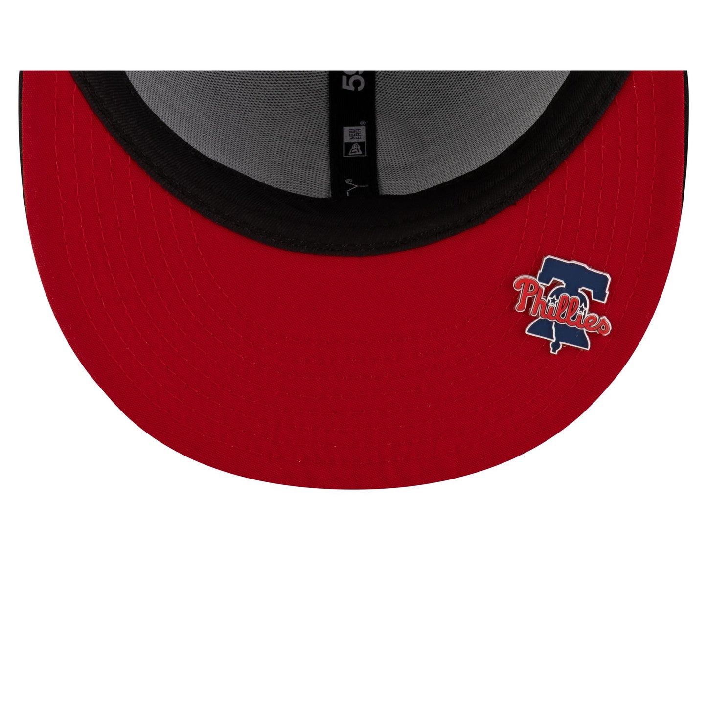 The Philadelphia Phillies 2025 Clubhouse Alt Black 59FIFTY Fitted Cap features an embroidered Phillies alternate logo at the front panels with a matching MLB Batterman logo at the rear. Additional details include a dashmark mesh fabrication and a silicone logo on the undervisor.