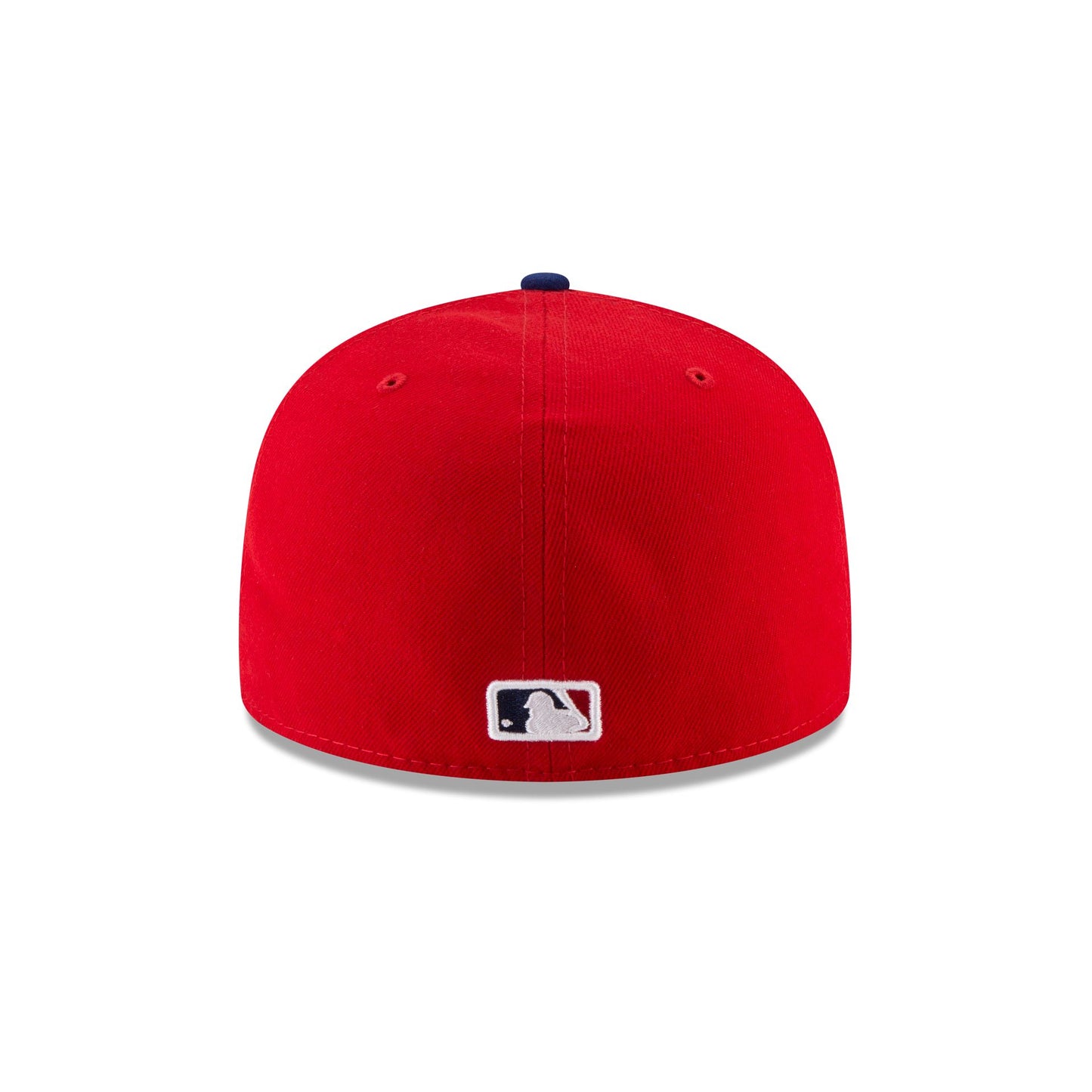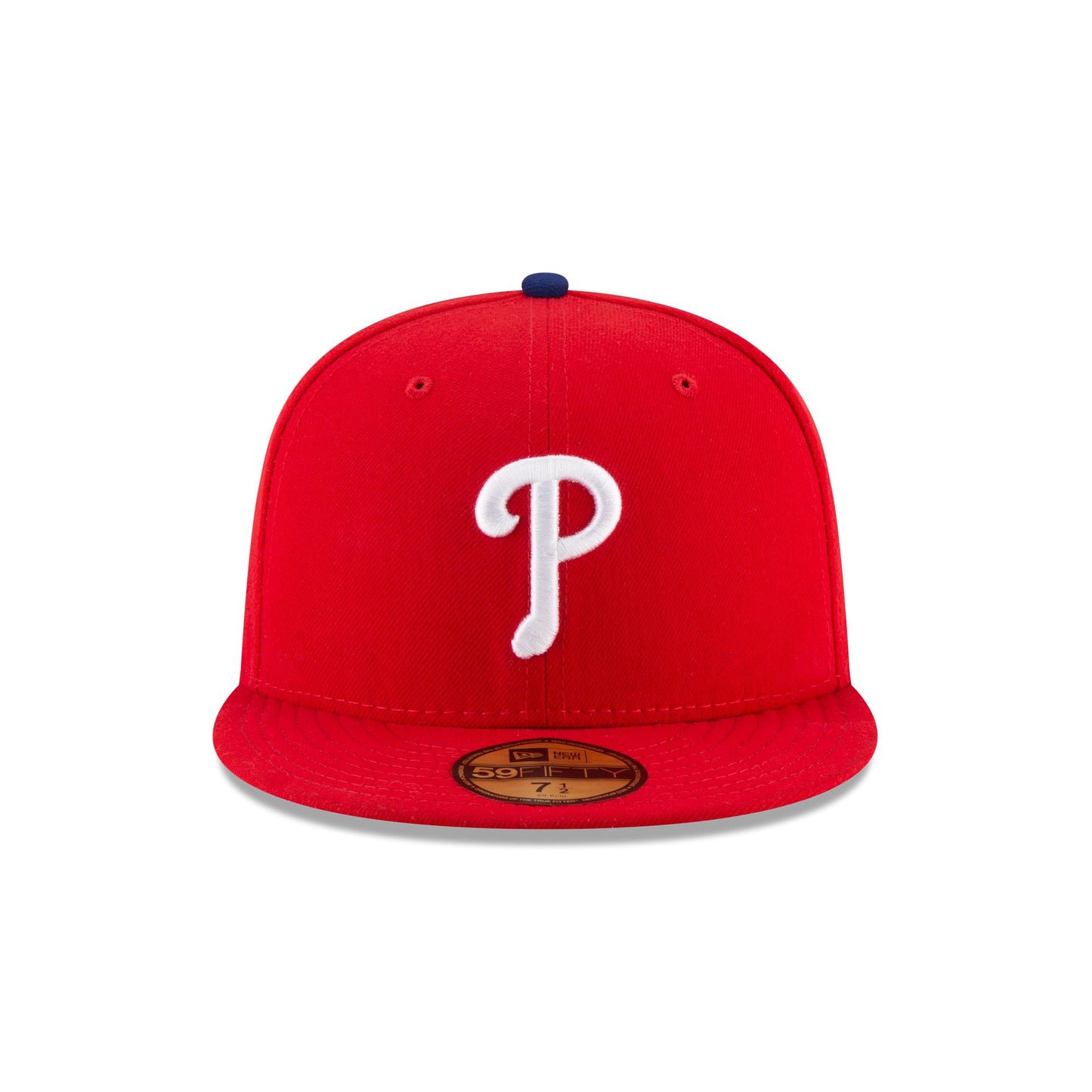 The Philadelphia Phillies 2025 Postseason Side Patch 59FIFTY Fitted Cap features an embroidered Phillies logo at the front panels with a 2025 Postseason patch at the right-wear side and the MLB Batterman logo at the rear.