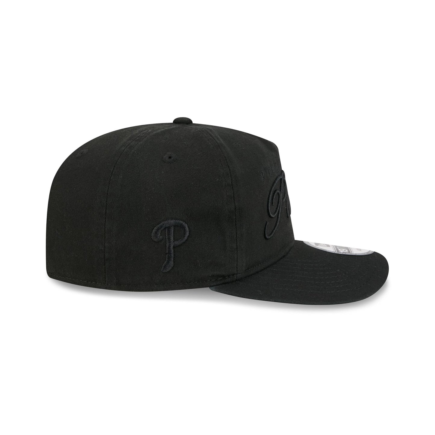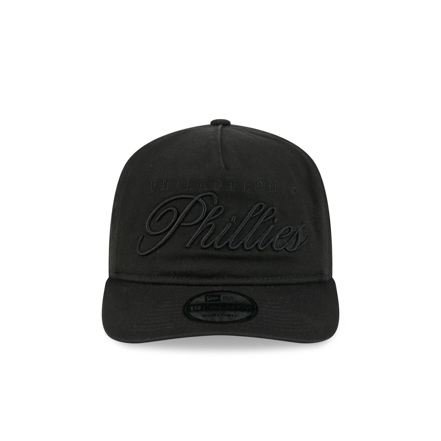 The Philadelphia Phillies All Black Scripted 19TWENTY Adjustable Cap features an embroidered Phillies all black script wordmark at the front panels with a matching team logo at the right-wear side. Additional details include an adjustable snapback closure at the rear and a gray undervisor.