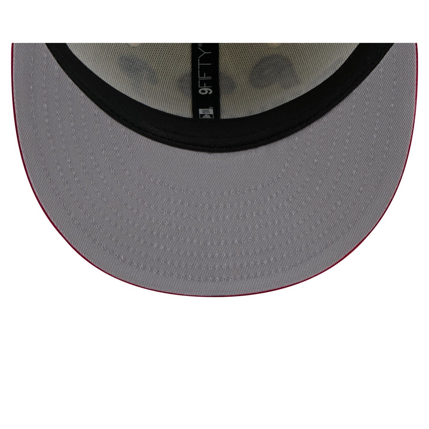 The Philadelphia Phillies Archive 9FIFTY Snapback features an embroidered Phillies wordmark and various team logos at the front panels with a snapback closure at the rear and a gray undervisor.