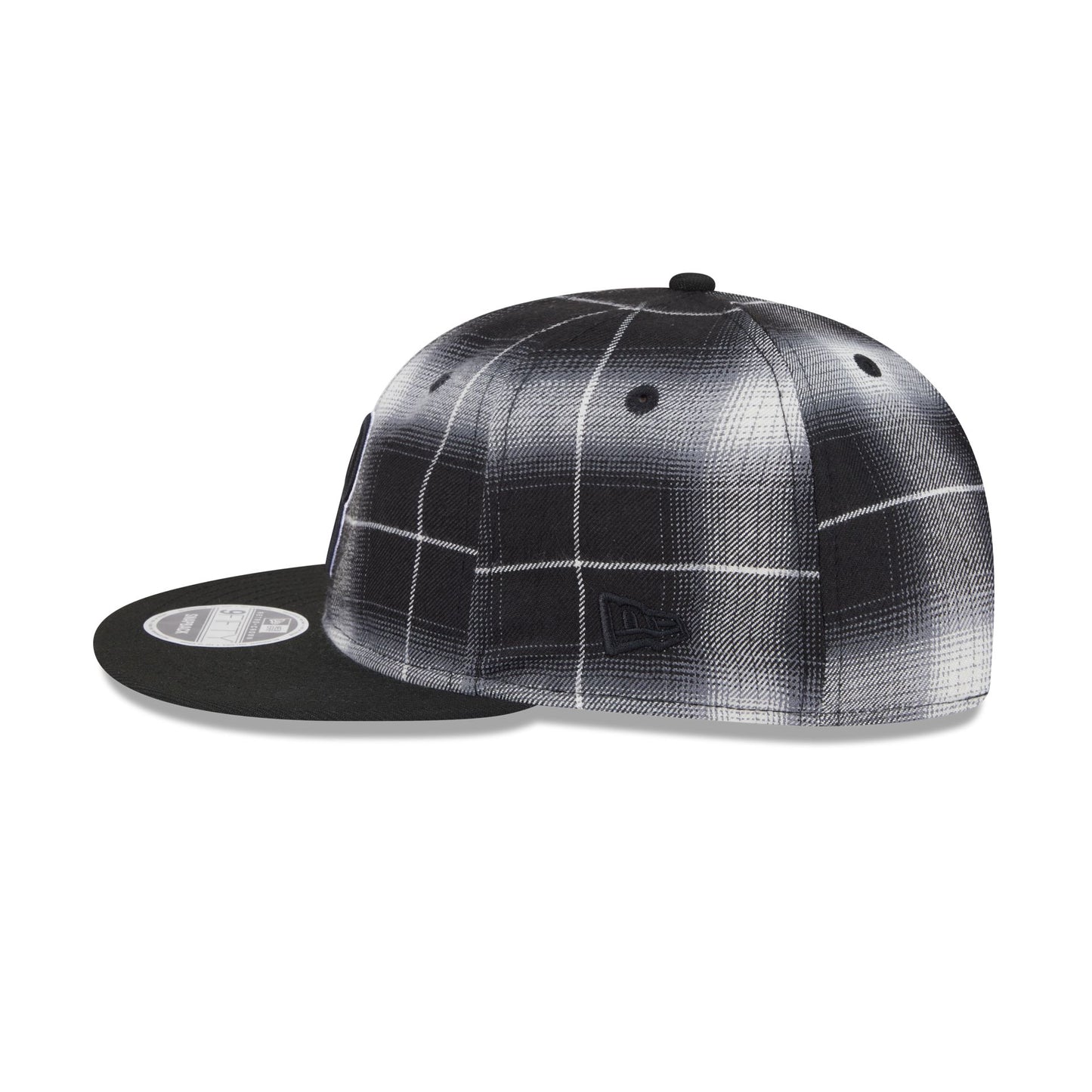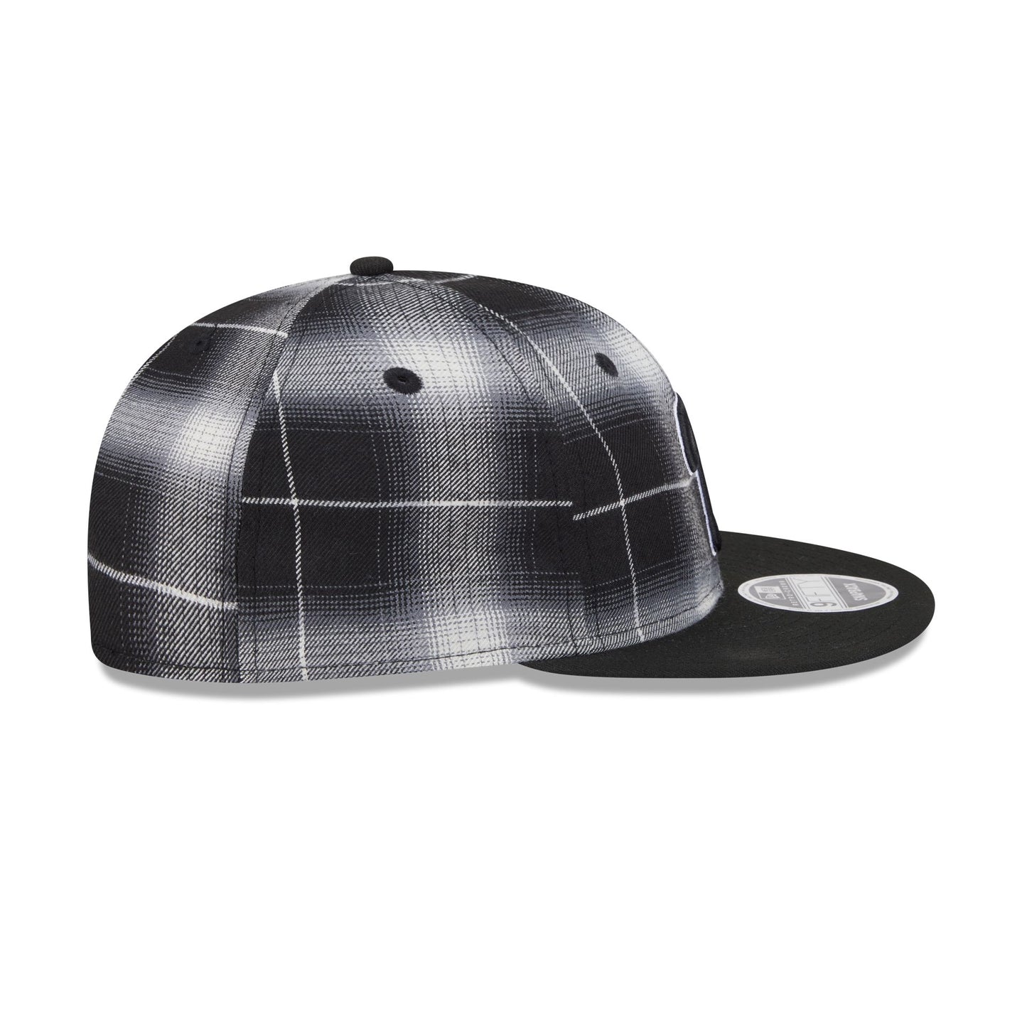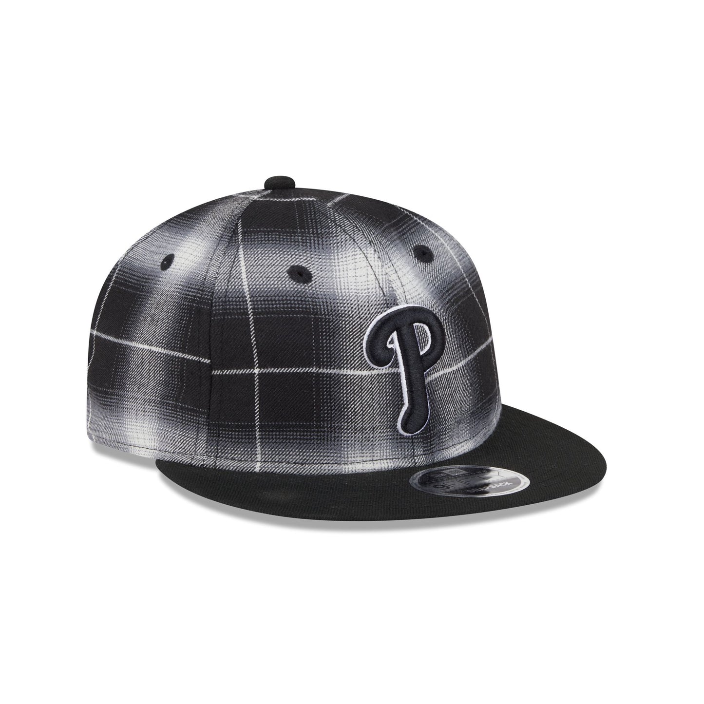 The Philadelphia Phillies Black and White Plaid Retro Crown 9FIFTY Snapback features an embroidered Phillies logo at the front panels with a black visor, a gray undervisor, and a snapback closure at the rear.
