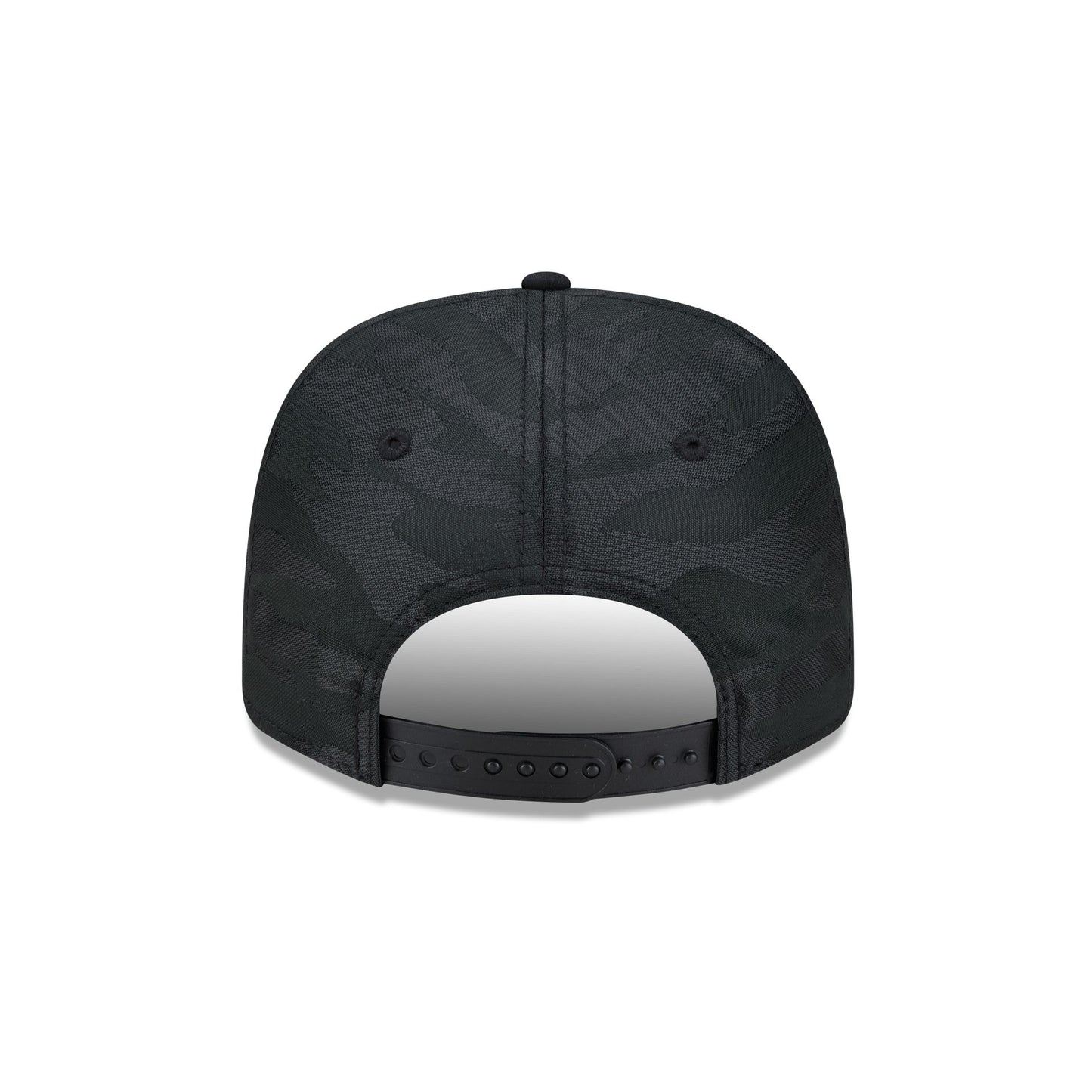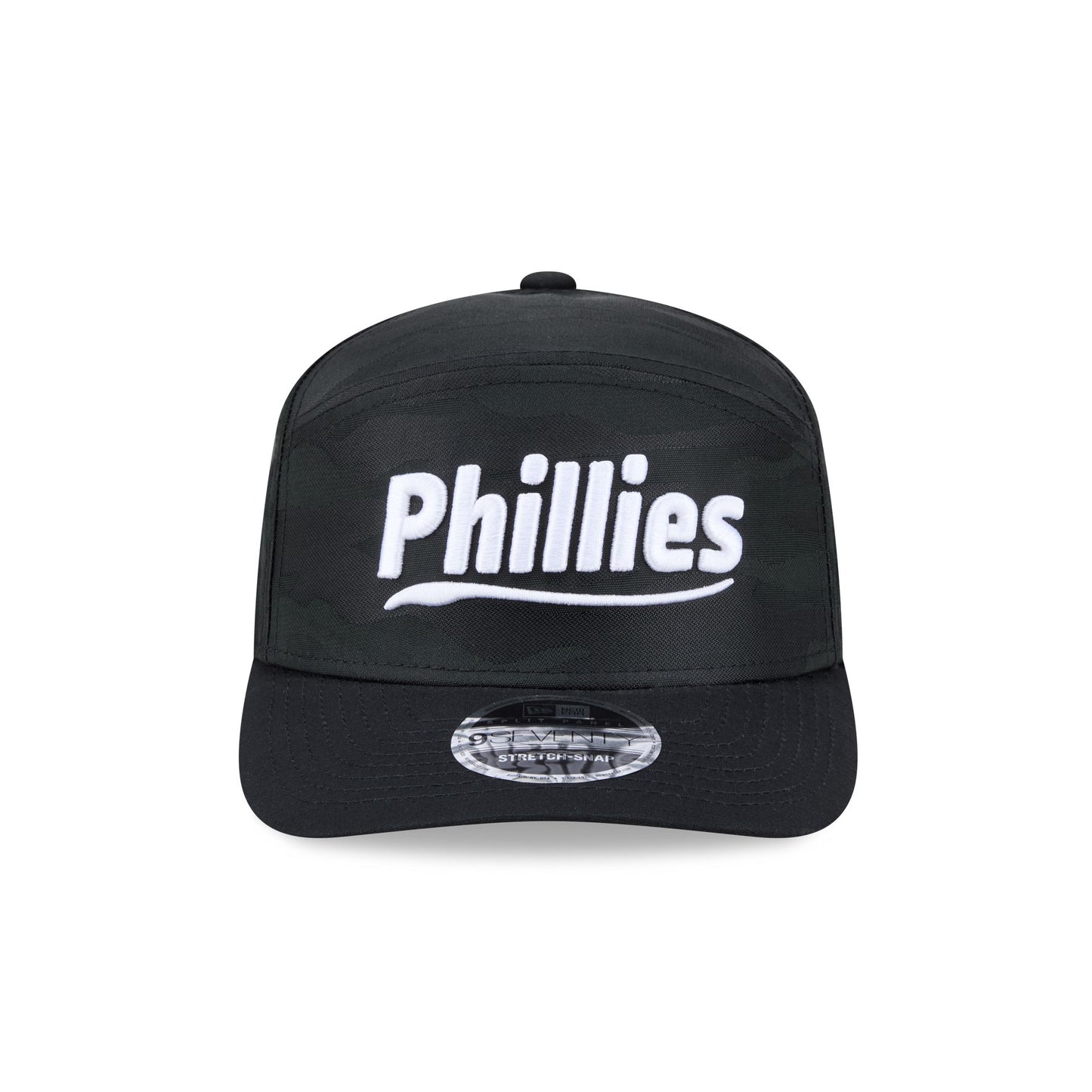 The Philadelphia Phillies Black Camo Split Panel 9SEVENTY Stretch-Snap features an embroidered Phillies white wordmark at the front panel with a split crown construction and a team logo at the right-wear side. Additional details include a black camo print throughout, an adjustable stretch-snap closure at the rear, and a gray undervisor.