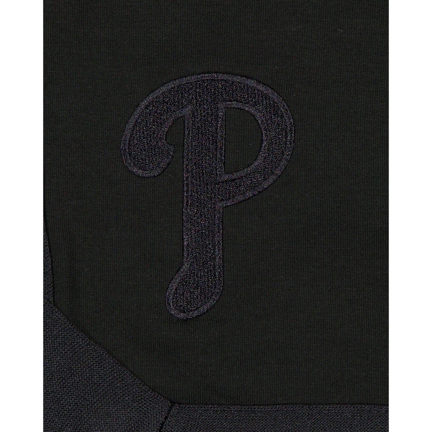 The Philadelphia Phillies Black on Black Logo Select Shorts features an embroidered Phillies logo at the right-wear leg and a satin applique with a tonal stitch team wordmark at the rear left leg.