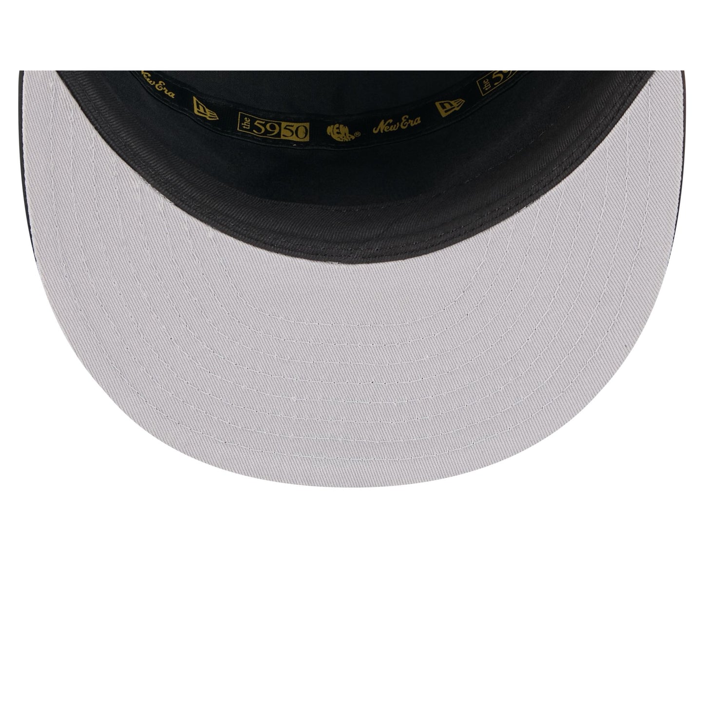 The Philadelphia Phillies Black Poly Rope 59FIFTY Split Panel Fitted Cap features a woven Phillies logo at the front panels with a matching MLB Batterman embroidered at the rear. Additional details include a rope at the visor and a gray undervisor.