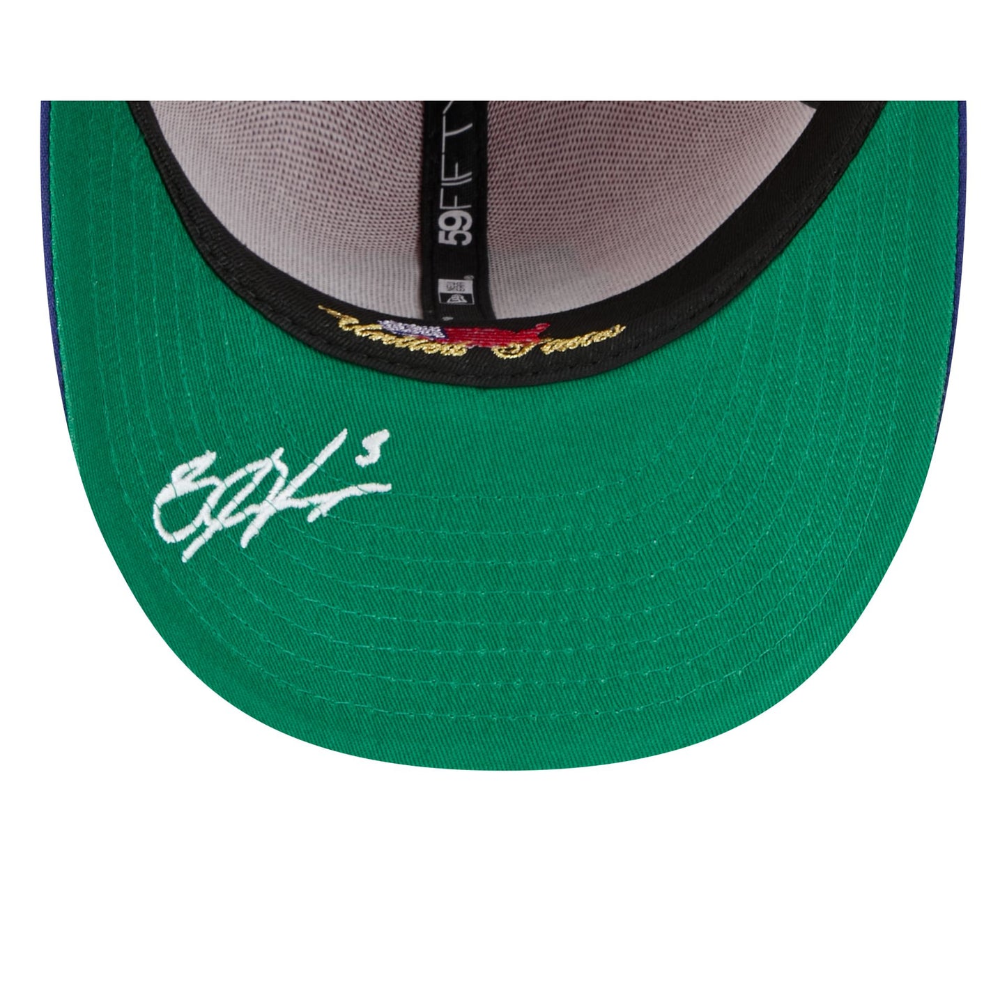 The Philadelphia Phillies Bryce Harper 59FIFTY Fitted Cap features an embroidered Harper figure and player number at the front panels with a matching MLB Batterman logo at the rear. Additional details include a Phillies logo at the right-wear side with a blue visor and the player's signature at a green undervisor.