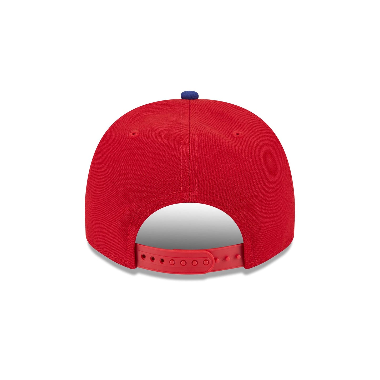 The Philadelphia Phillies Cartoon 9FIFTY A-Frame Snapback features an embroidered Phillies cartoon logo at the front panels with a matching team logo at the right-wear side. Additional details include an adjustable snapback closure at the rear and a gray undervisor.