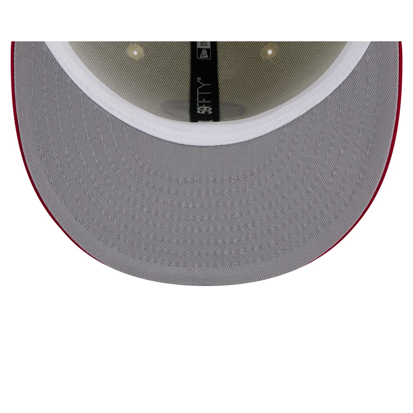 The Philadelphia Phillies Chrome 59FIFTY Fitted Cap features an embroidered Phillies logo at the front panels with a matching MLB Batterman logo at the rear, a red visor, and a gray undervisor.