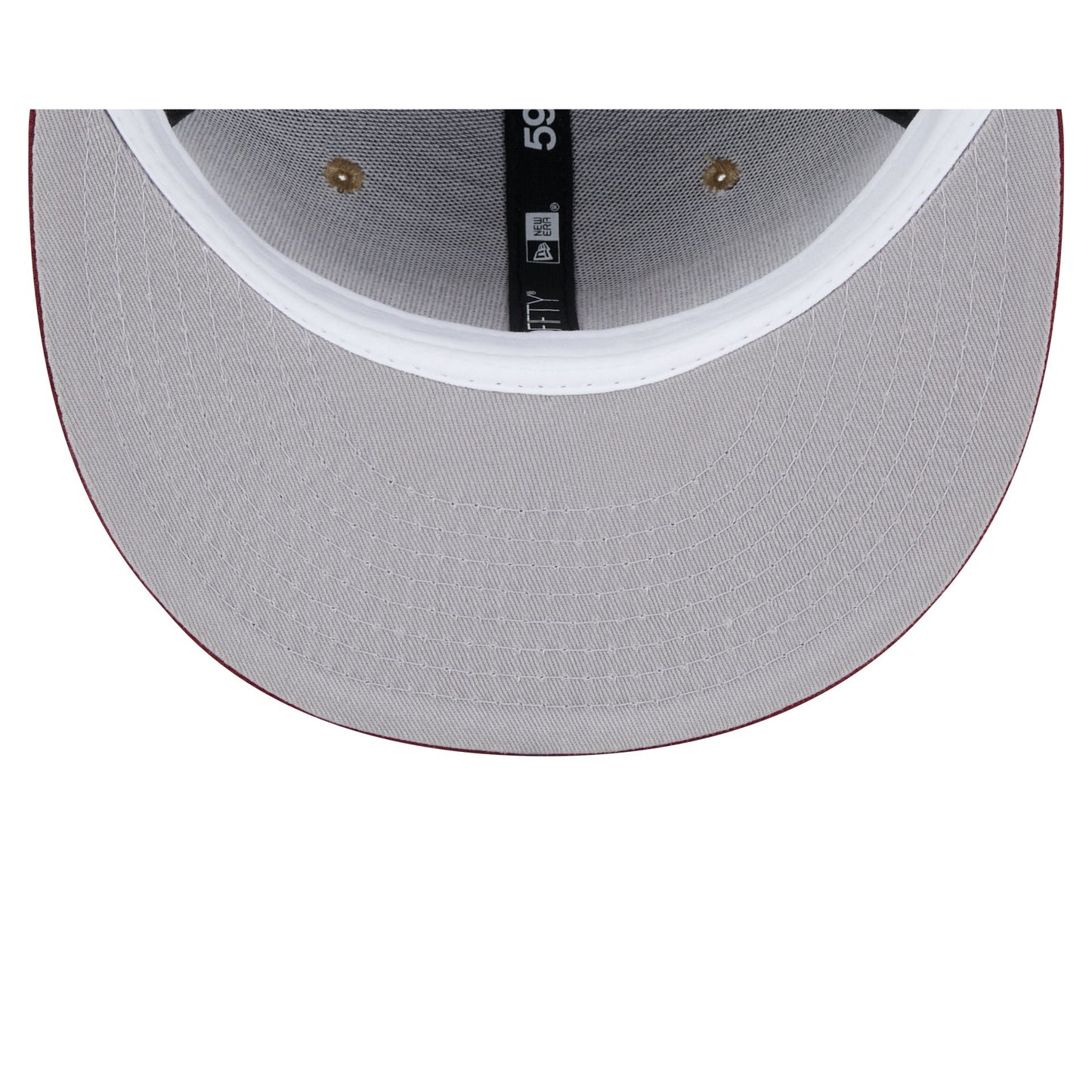 The Philadelphia Phillies Classic 8-Bit Wordmark 59FIFTY Fitted Cap featured an embroidered Phillies Cooperstown 8-bit stitch wordmark at the front panels. Additional details include a team wordmark with a matching MLB Batterman logo at the rear and a gray undervisor.