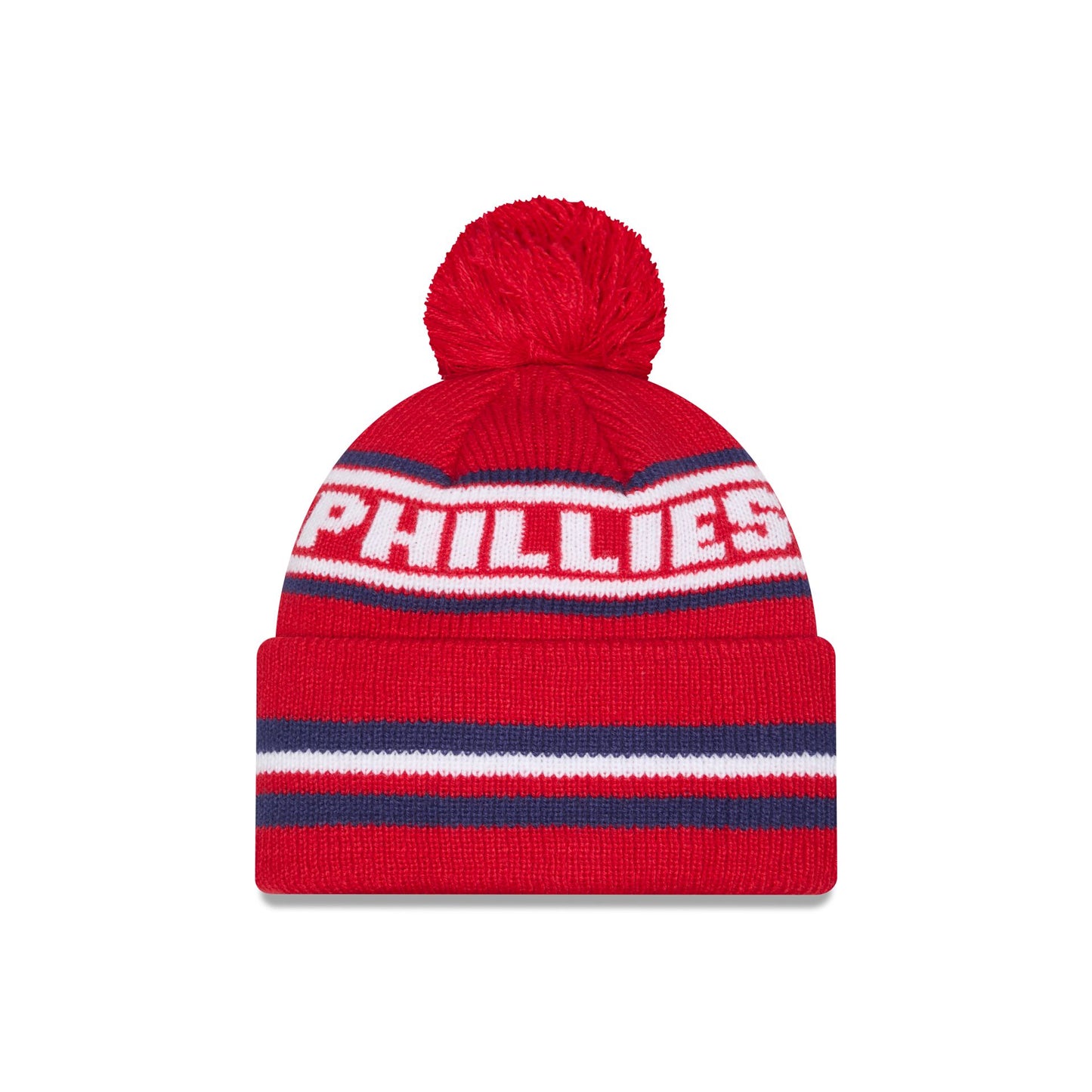 The Philadelphia Phillies Classic Pom Knit Hat features an embroidered Phillies logo at the front cuff with a wordmark at the crown and a one-time removable pom.