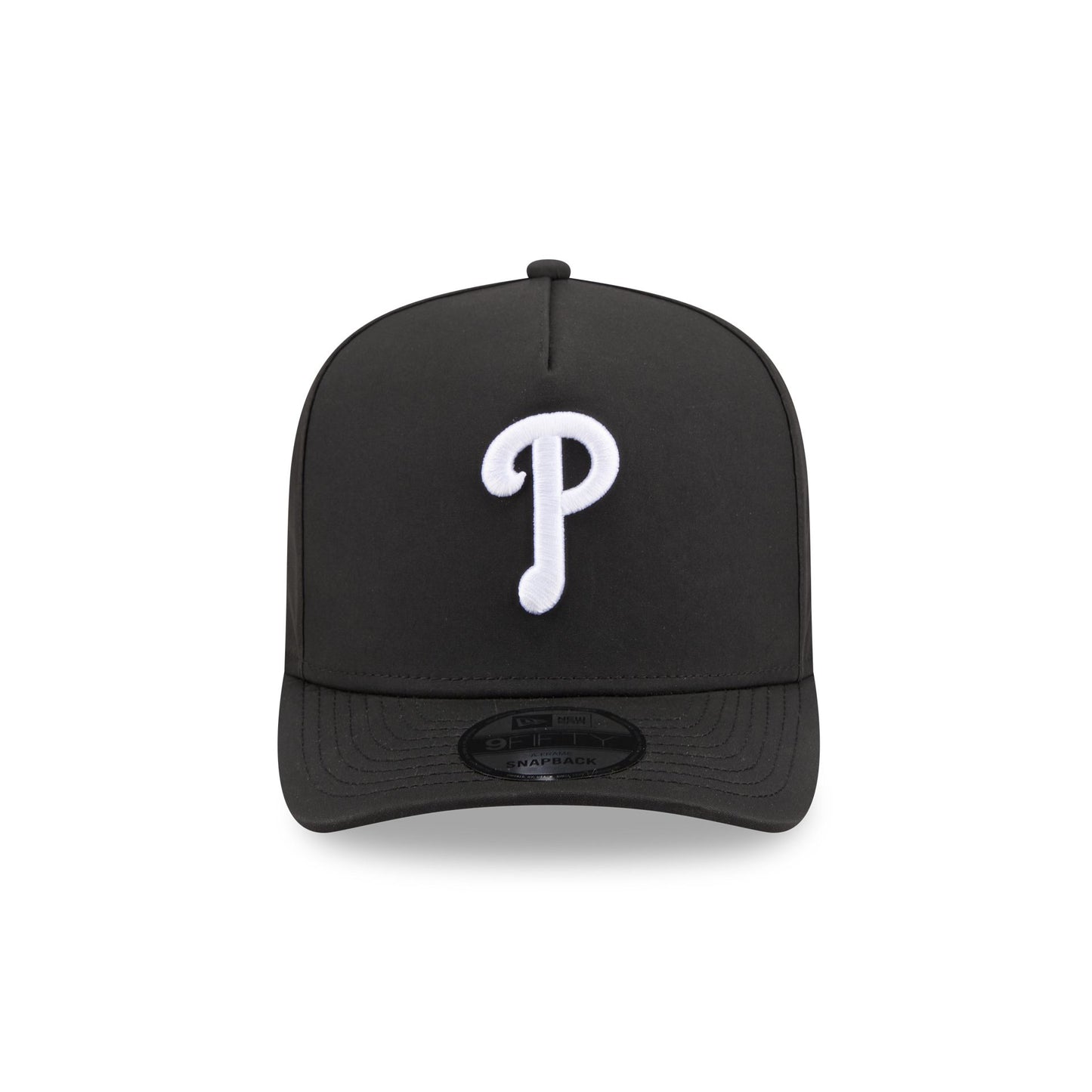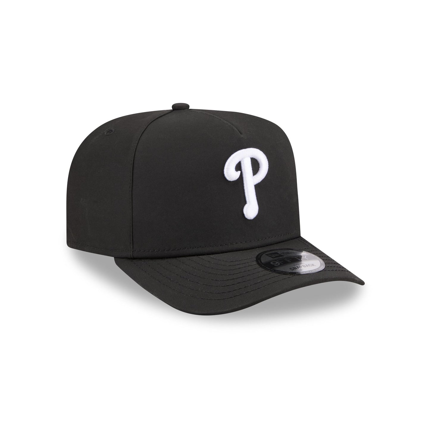 The Philadelphia Phillies GORE-TEX Black 9FIFTY A-Frame Snapback features an embroidered white Phillies logo at the front panels with a metallic sheen silicone New Era Flag logo and GORE-TEX logo at the left-wear side. Additional details include an adjustable snapback closure at the rear, a gray undervisor, and a polyester fabrication throughout the cap. It is waterproof, breathable, and lightweight.
